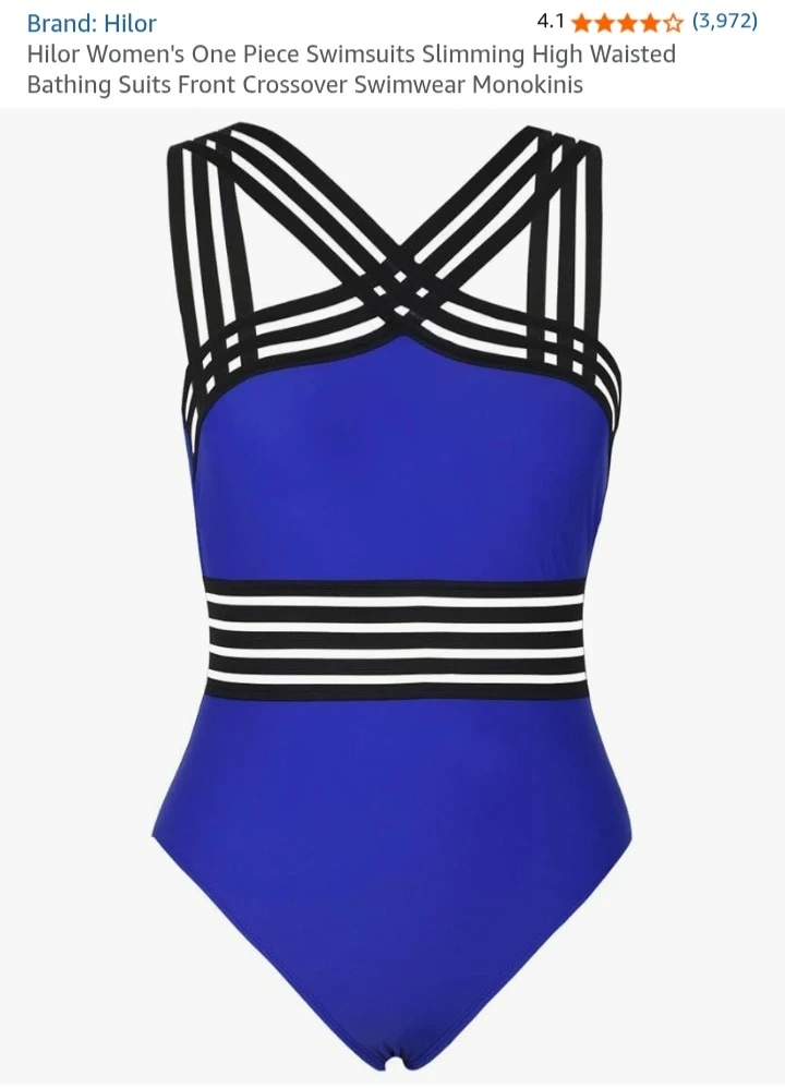 This Hilor one piece swimsuit is a royal blue colour with a flattering high-waisted design. It features a stylish criss-cross halter neckline and mesh detailing at the waist for added flair. It's perfect for a day at the beach or pool!