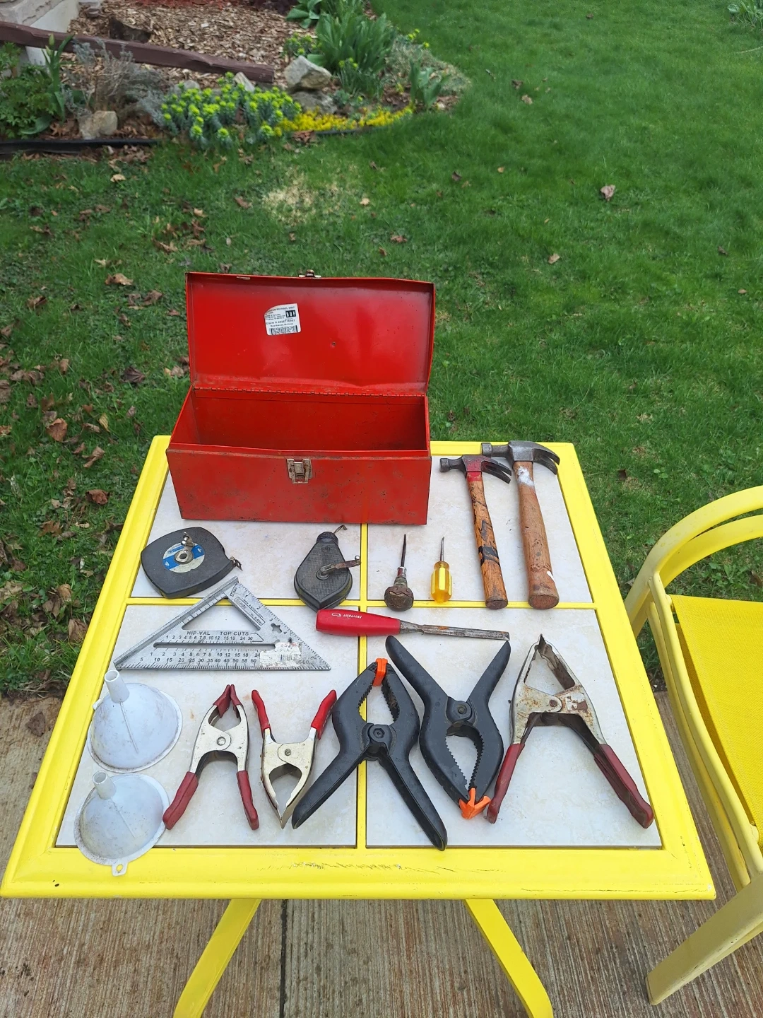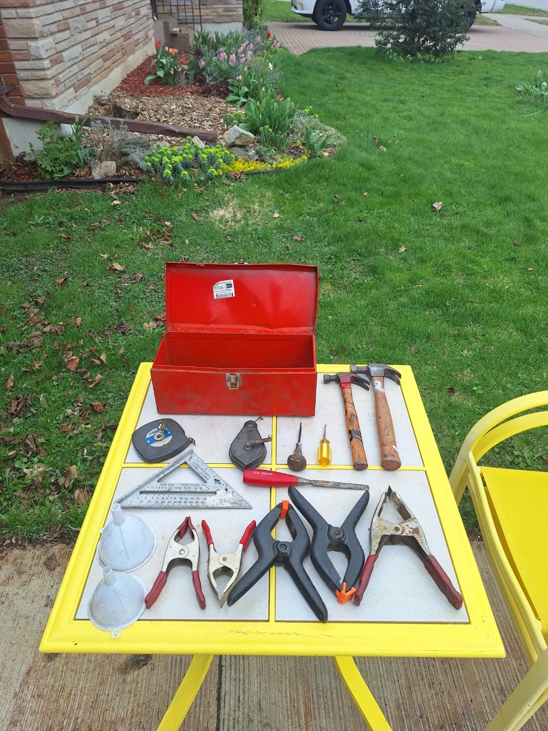 Includes a red metal toolbox, hammers, clamps, a measuring tape, a square, and other miscellaneous hand tools. Items are in used condition, perfect for a variety of DIY projects.