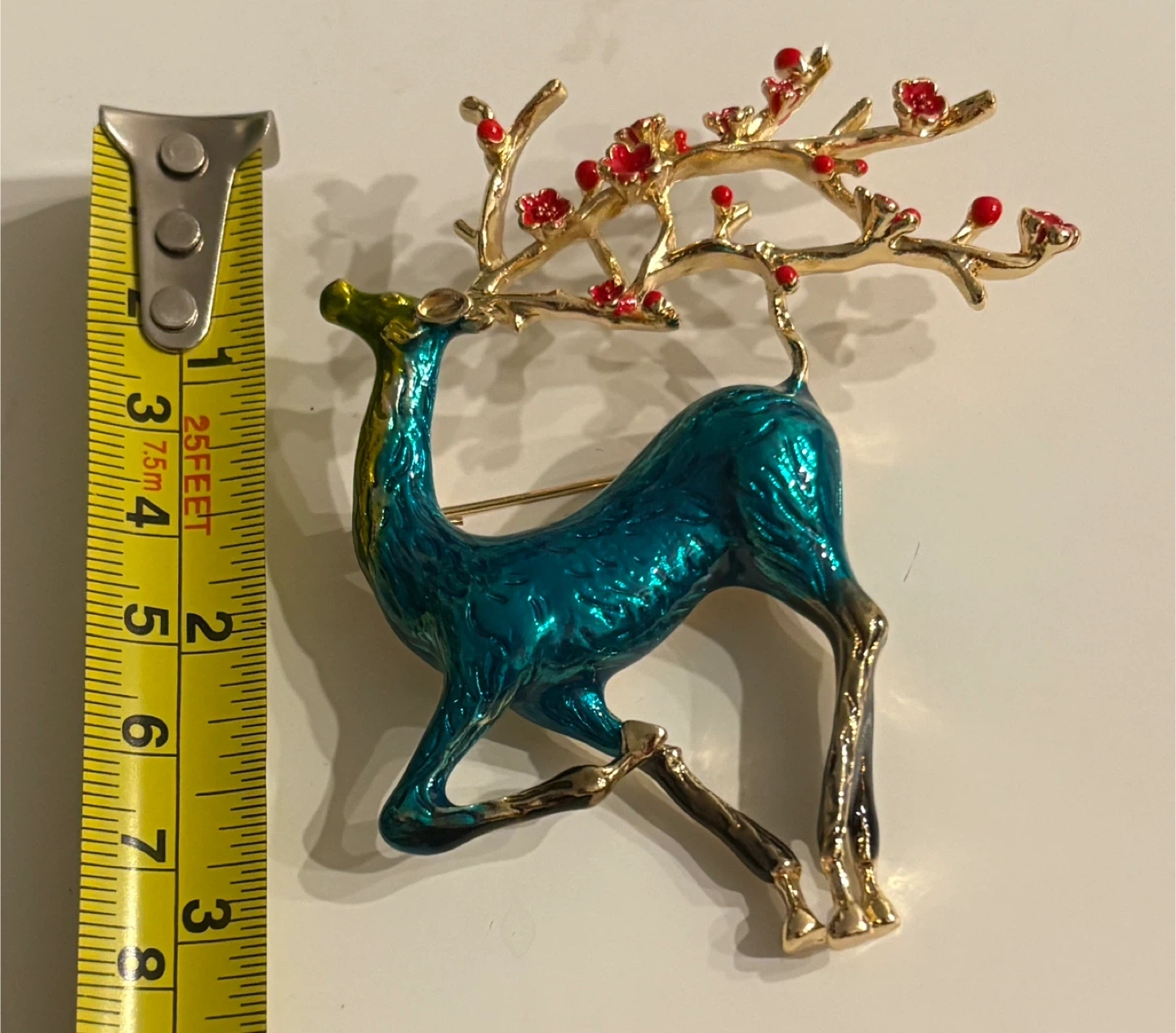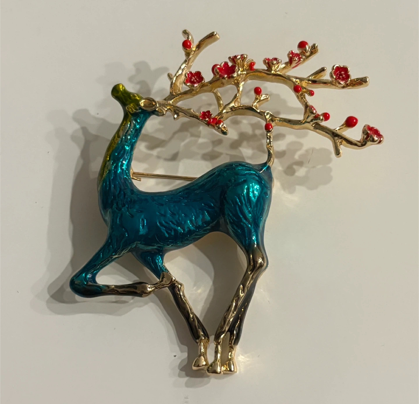 Beautiful Gold & Teal Reindeer Brooch with Red Flowers