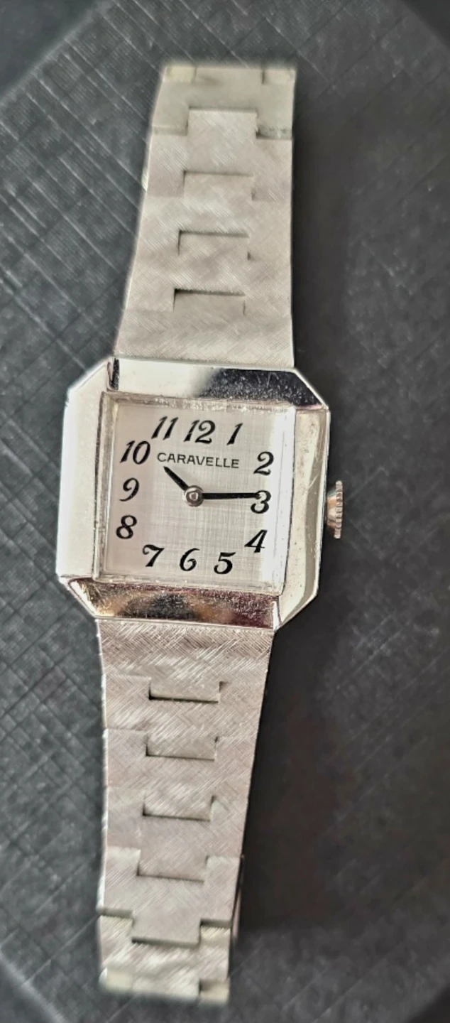 This is a Caravelle women's wristwatch. It features a silver-tone metal band and a rectangular watch face with Arabic numerals. This watch is suitable for everyday wear.