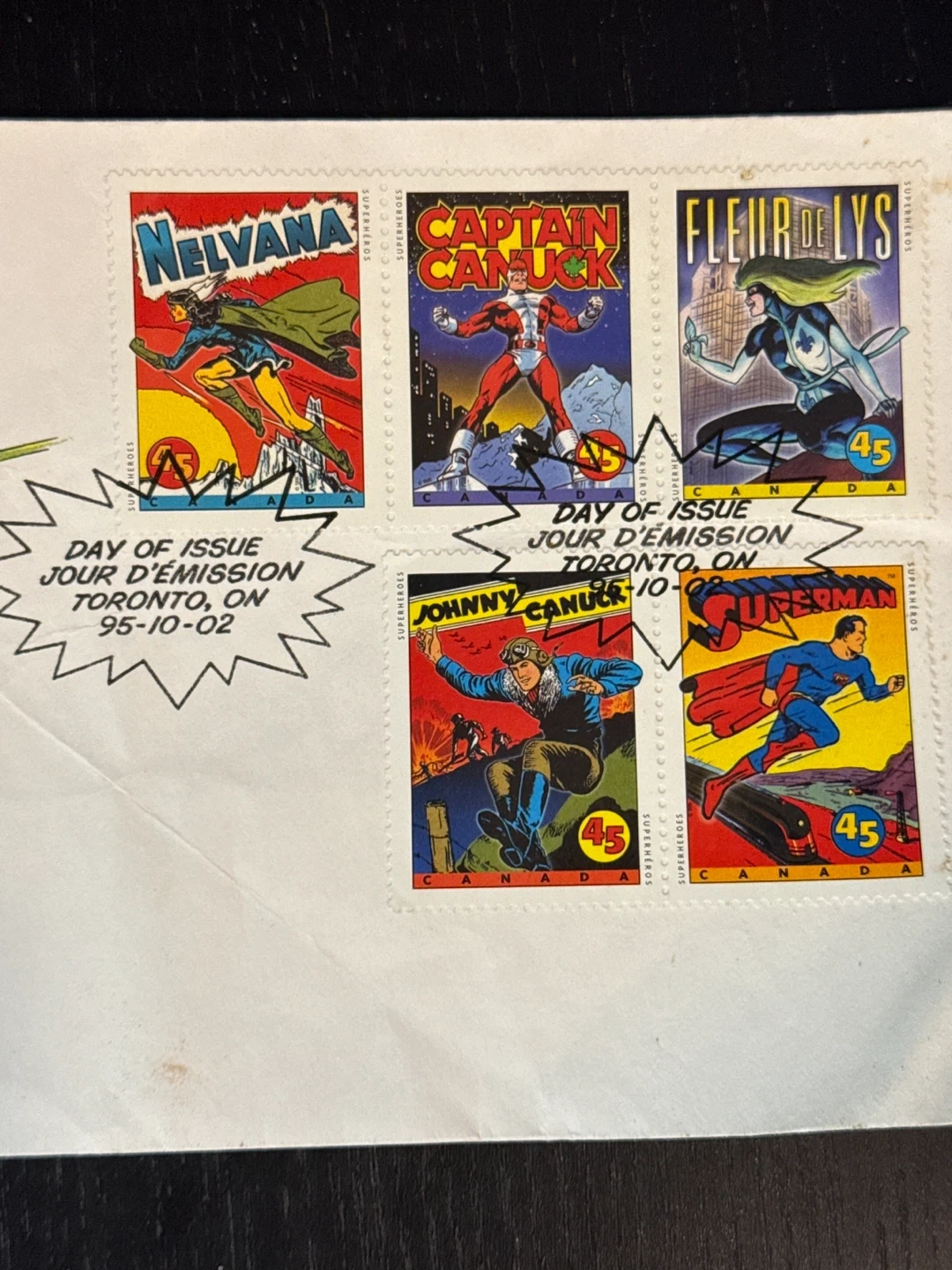 This is a Canada Post Day of Issue stamp sheet from Toronto, ON, dated 95-10-02. It features Canadian superheroes Nelvana, Captain Canuck, Fleur de Lys, and Johnny Canuck, along with Superman. The sheet showcases collectible Canadian comic book heroes.