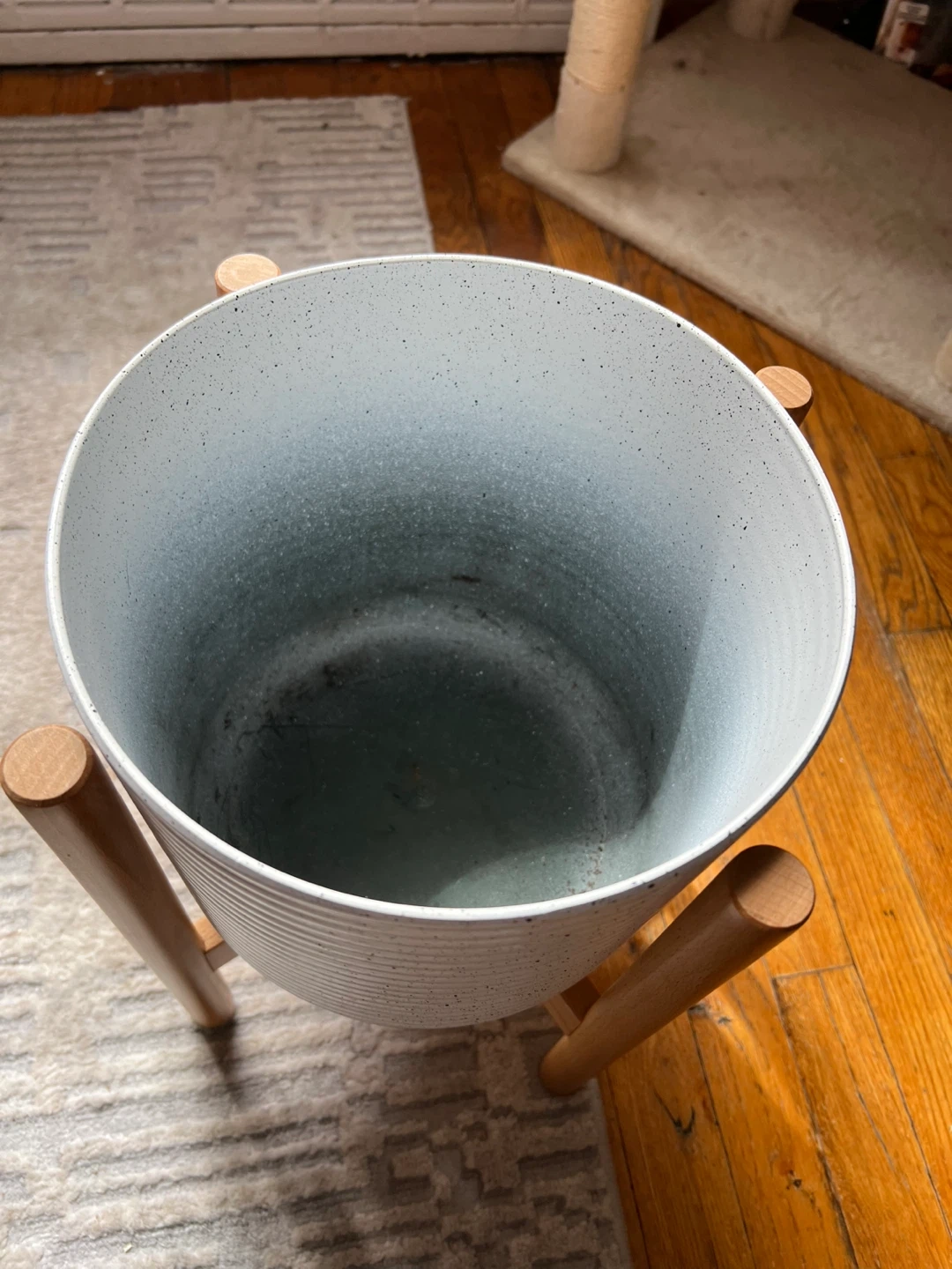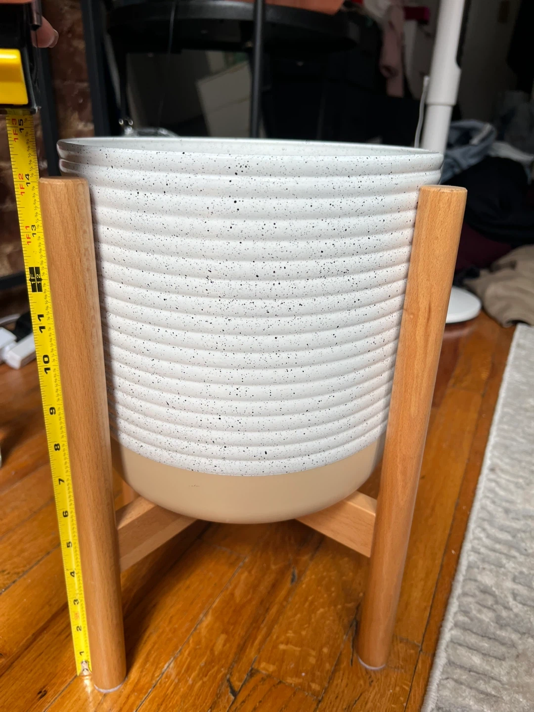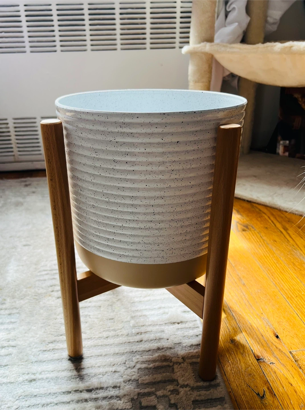 White Speckled Plastic Planter with Wood Stand