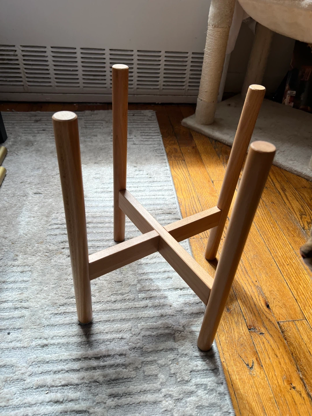 White speckled planter with a light brown base. It's supported by a natural wood stand. This planter's dimensions are approximately 10 inches tall and 9 inches in diameter. It's perfect for adding a touch of green to your living space!