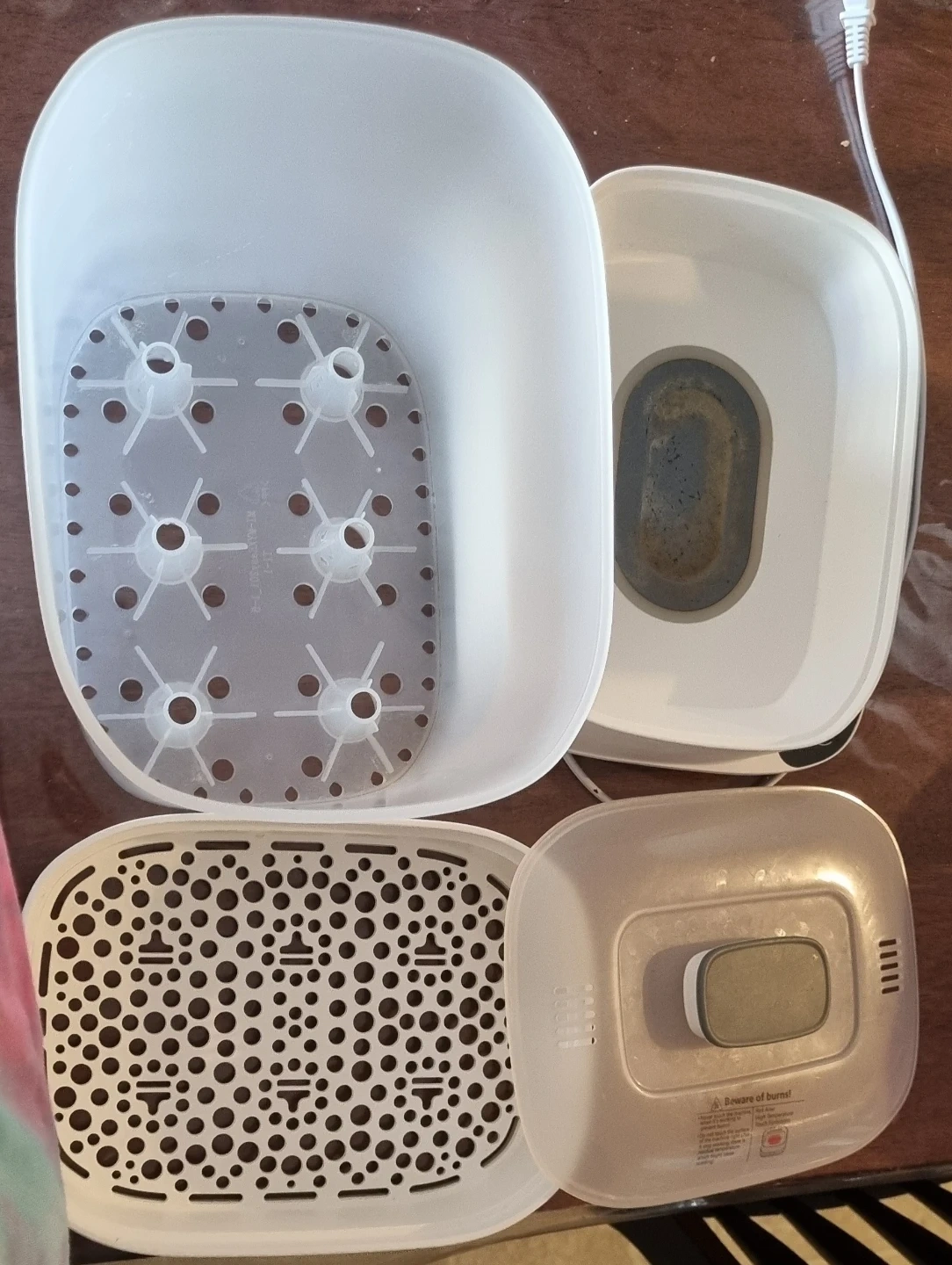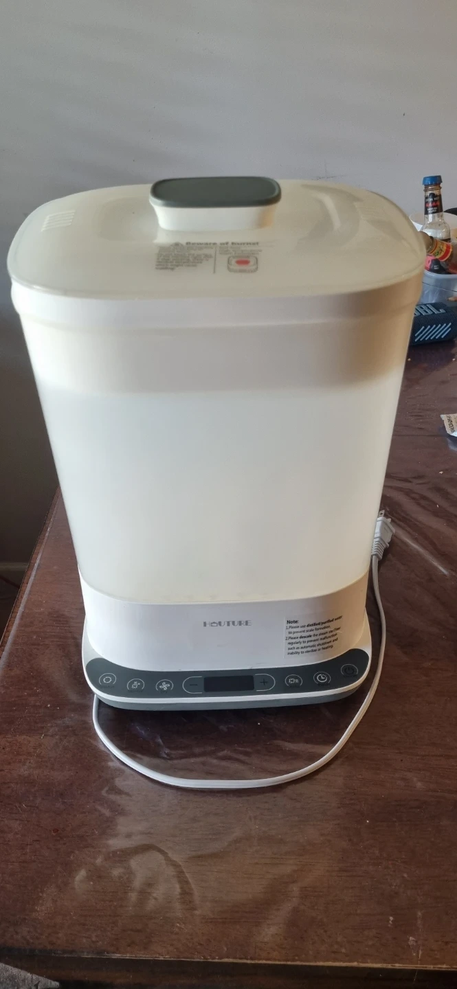 HOUTURE electric sterilizer for baby bottles, fit up to 6 bottles and has top shelf for bottle tops and accessories etc.