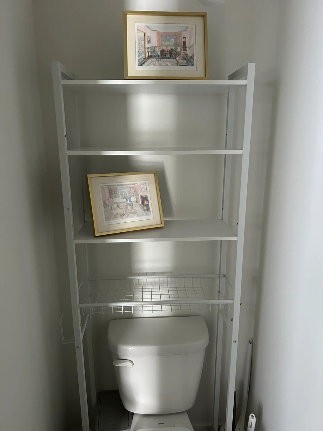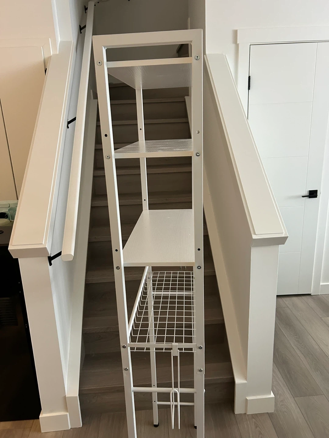 This four-tier metal shelf unit comes in white and includes a wire basket. It's designed for easy storage and organization. This shelving unit is great for bathrooms or tight spaces!