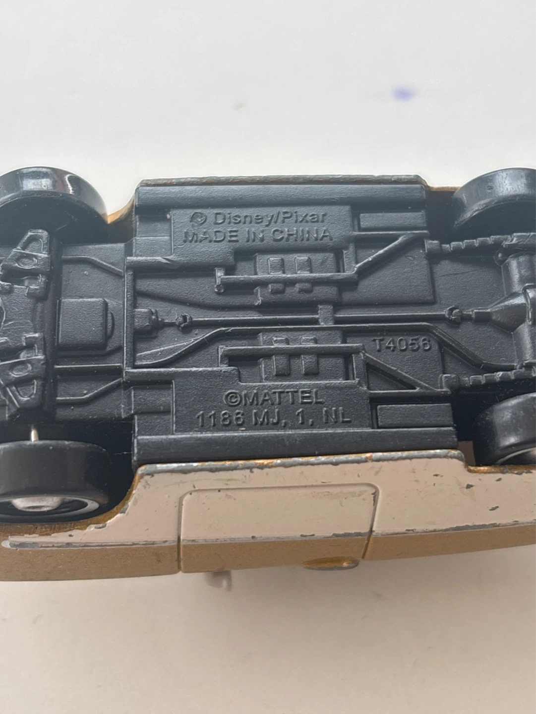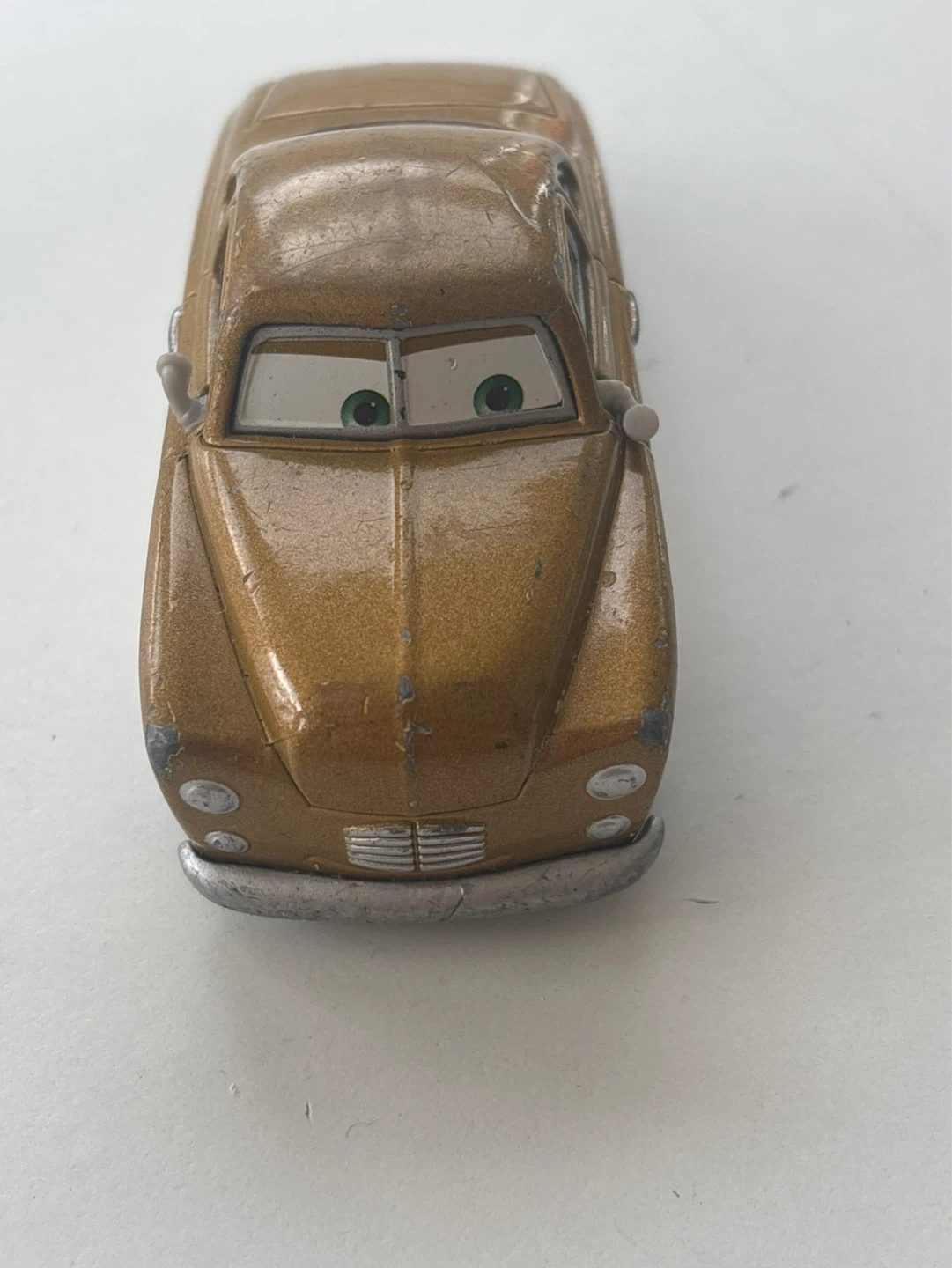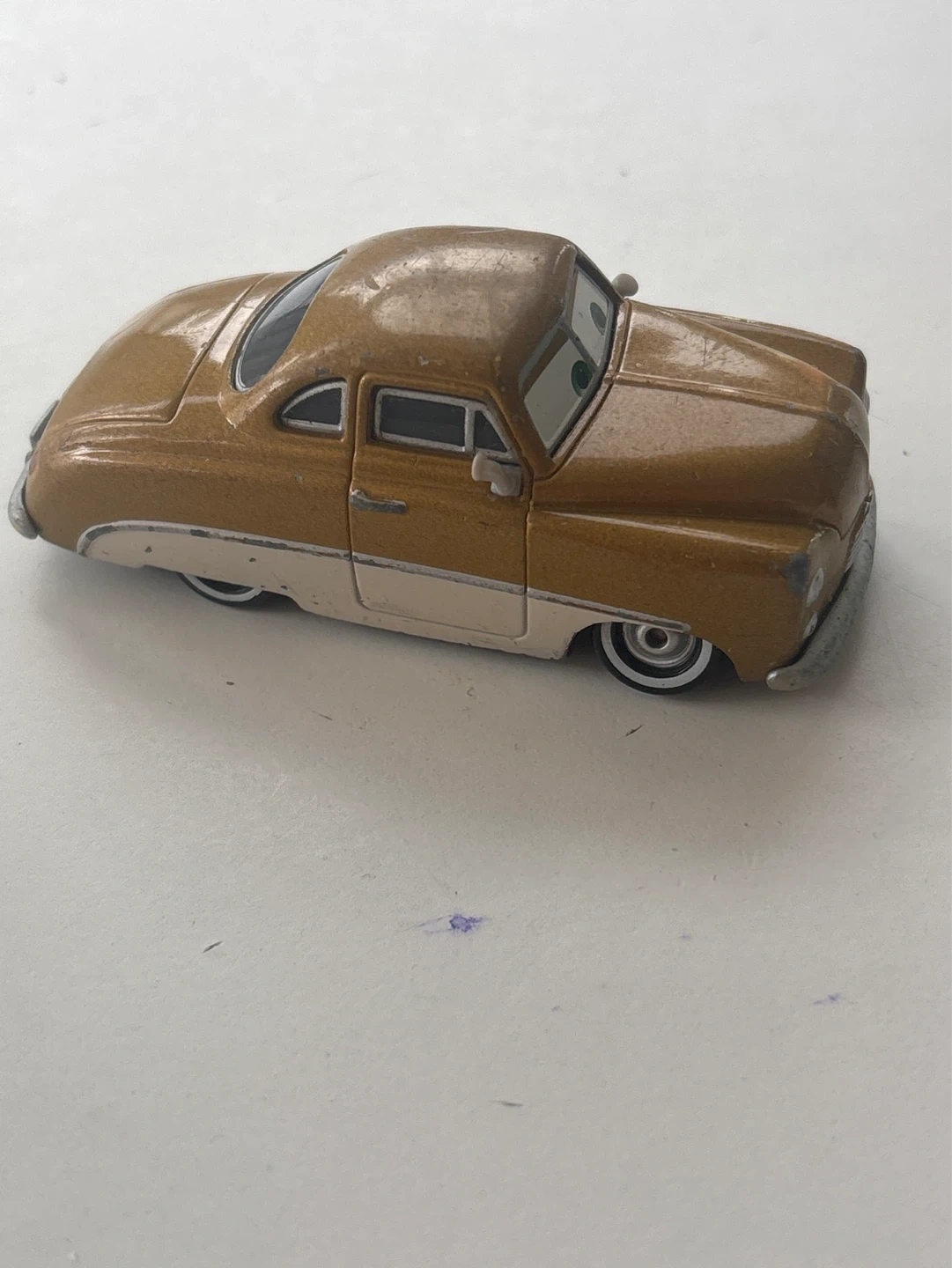 This is a gold and cream coloured Luigi die-cast car from Mattel, based on the Disney/Pixar Cars movie. Made in China. Suitable for collectors or play.
