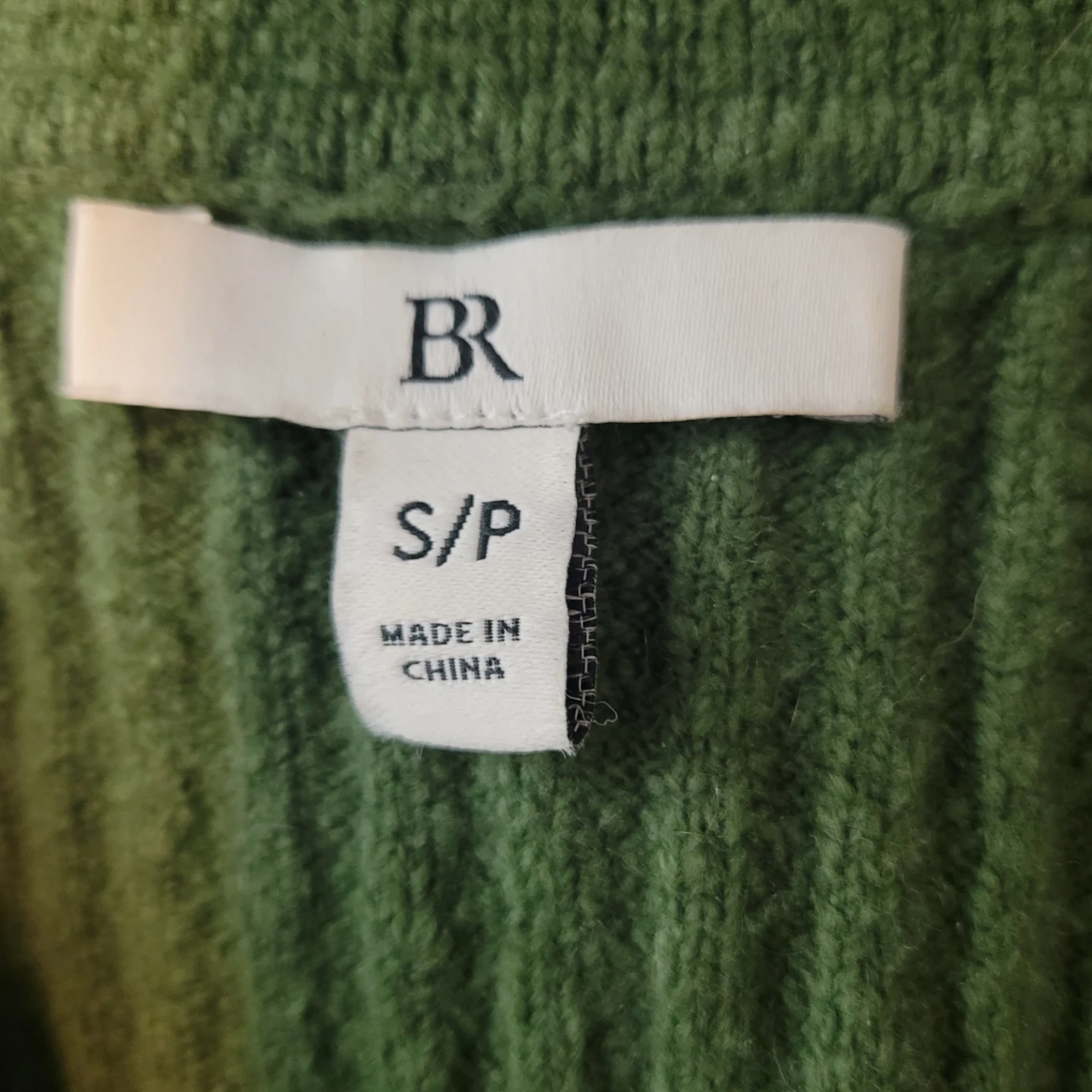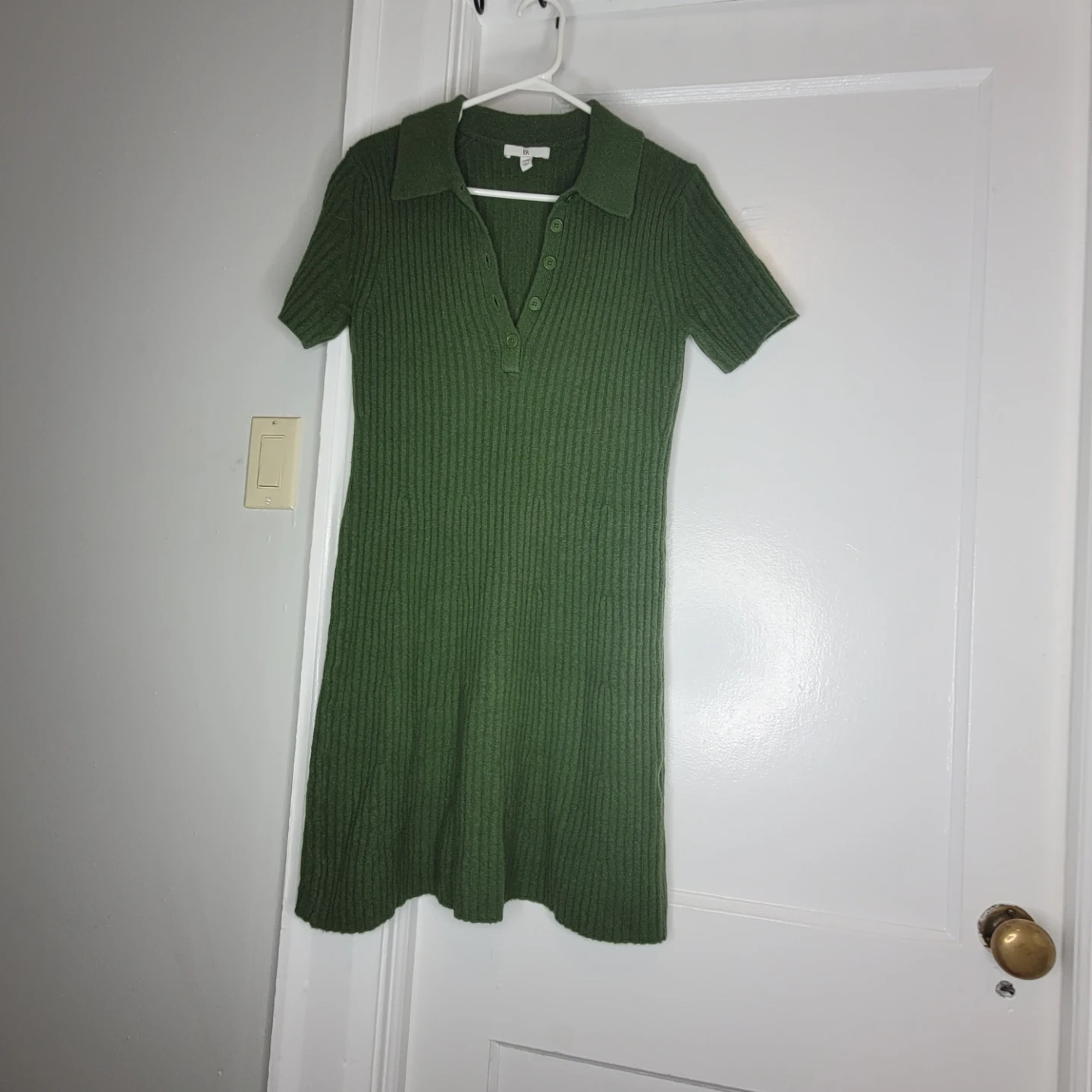 This BR green ribbed dress features a collared neckline and short sleeves. It's a size S/P. The dress is made of a knit material.