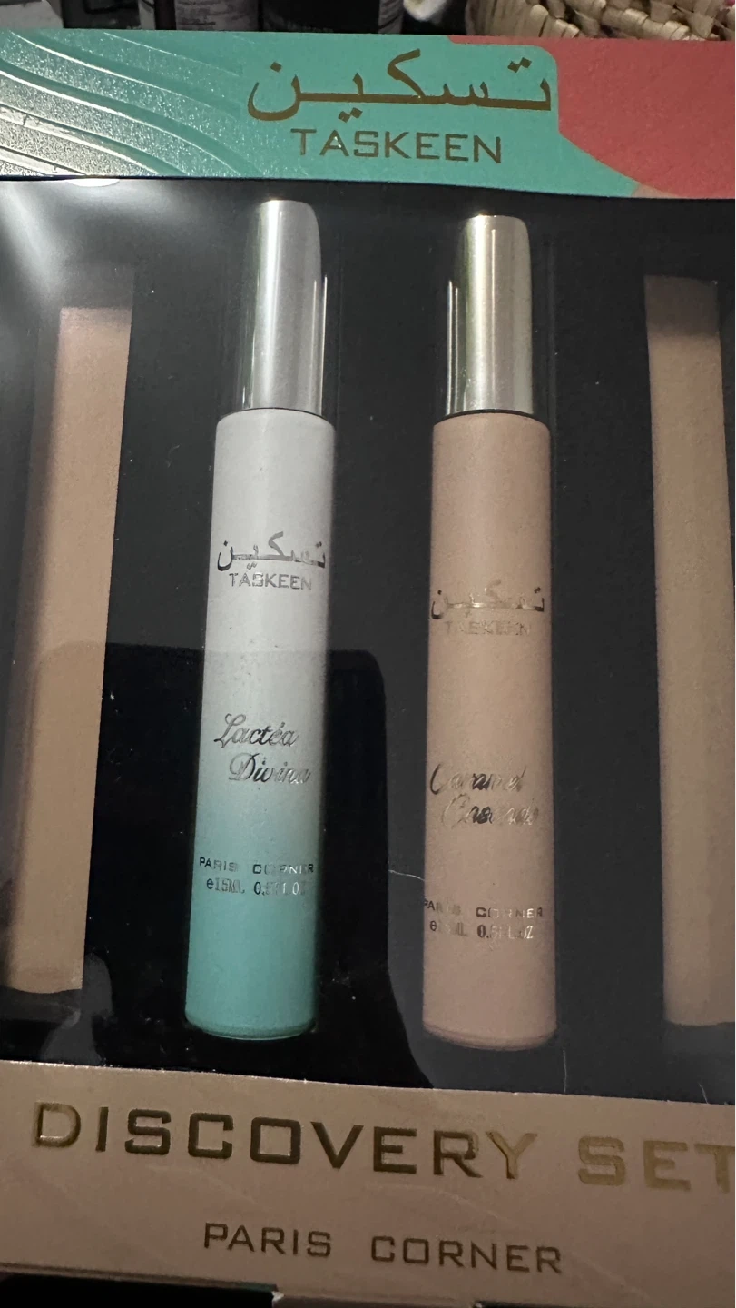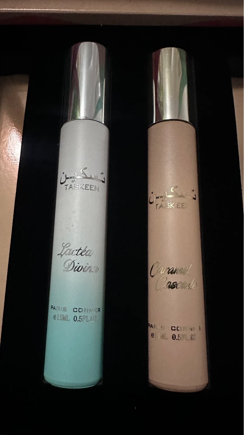 This set includes two perfumes from Paris Corner's Taskeen line: Lactea Divina and Caramel Cascade. Each bottle contains 15ml (0.5 fl. oz.) of fragrance. These scents are great for discovering new aromas.
