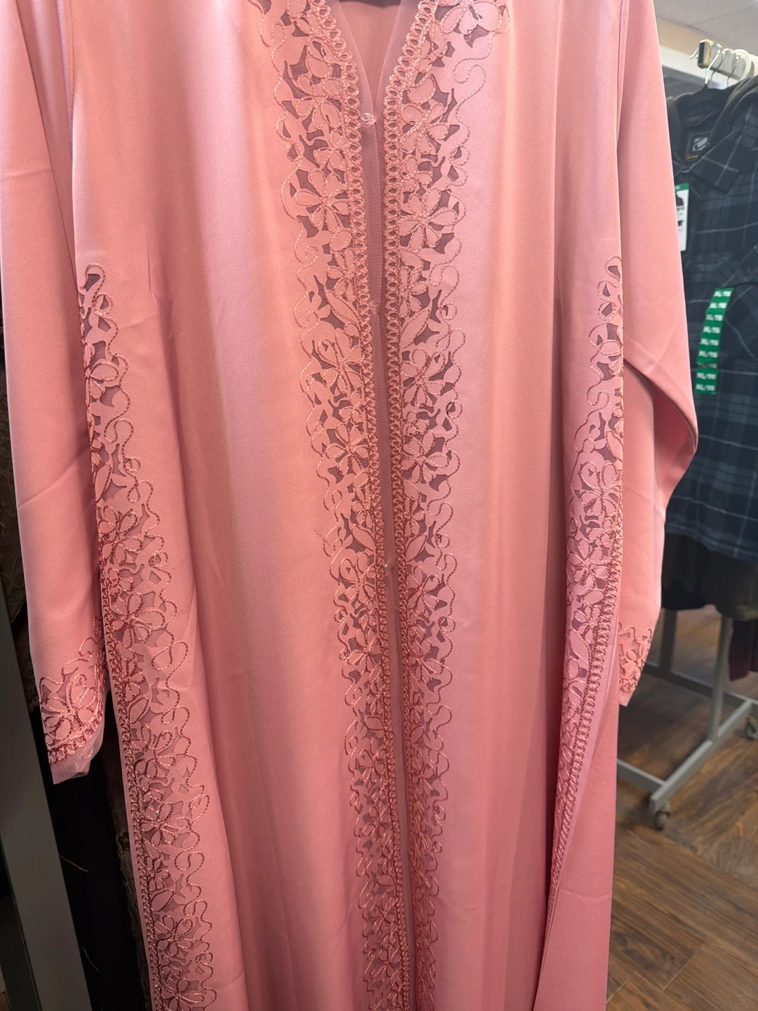 Pretty pink kaftan with intricate floral embroidery along the neckline and sleeves. It's a lovely piece for special occasions. The material looks lightweight and flowy.Size 54 made in UAE