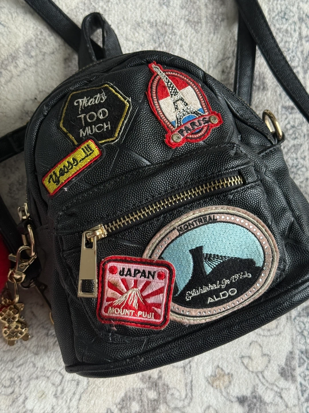 Cute black mini backpack from ALDO. It features various travel-themed patches, including Japan, Paris, and Montreal. Comes with a detachable red pom pom charm and a small bear charm. Faux leather material with gold hardware.