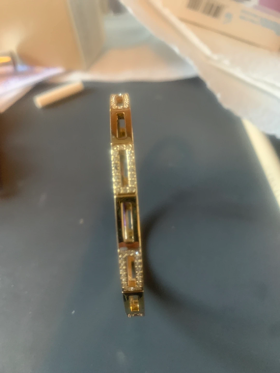 15Selling a lovely Swarovski gold plated bangle bracelet! It features a unique design with rectangular accents and sparkling details. Perfect for adding a touch of elegance to any outfit!