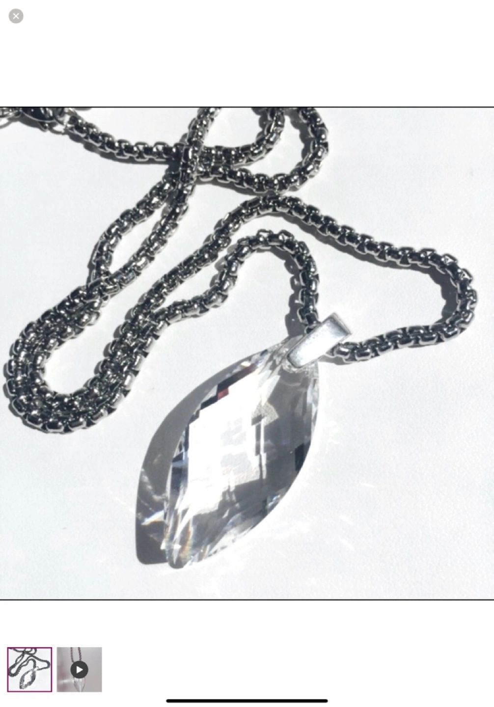 26Elegant clear crystal pendant necklace. Features a silver-tone chain and a faceted crystal. Looks great with any outfit. 40x18mm SWAROVSKI Navette Crystal Pendant. 925 Sterling Silver Bail 20" Stainless Steel Chain COLOURS CRYSTAL CLEAR Retails $160.00. 2025© Carla Niro/All Rights Reserved PET-FREE 🇨🇦 SMOKE-FREE HOME! https://carla-niro-design.square.site/product/vega/25?cp=true&sa=false&sbp=false&q=false&category_id=10