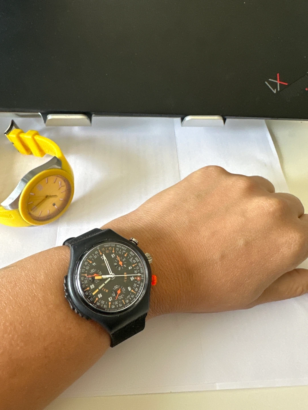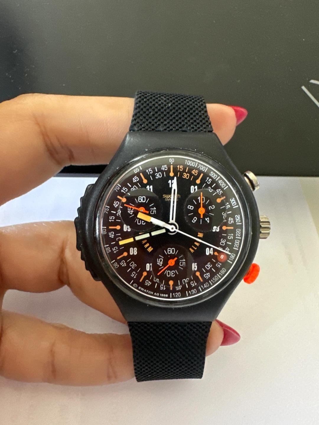 Selling a Swatch AG 1988 watch in black! It's in great condition and ready for a new owner. The design is super cool, with lots of details on the face. It's a real eye-catcher! Unisex. Needs new battery.