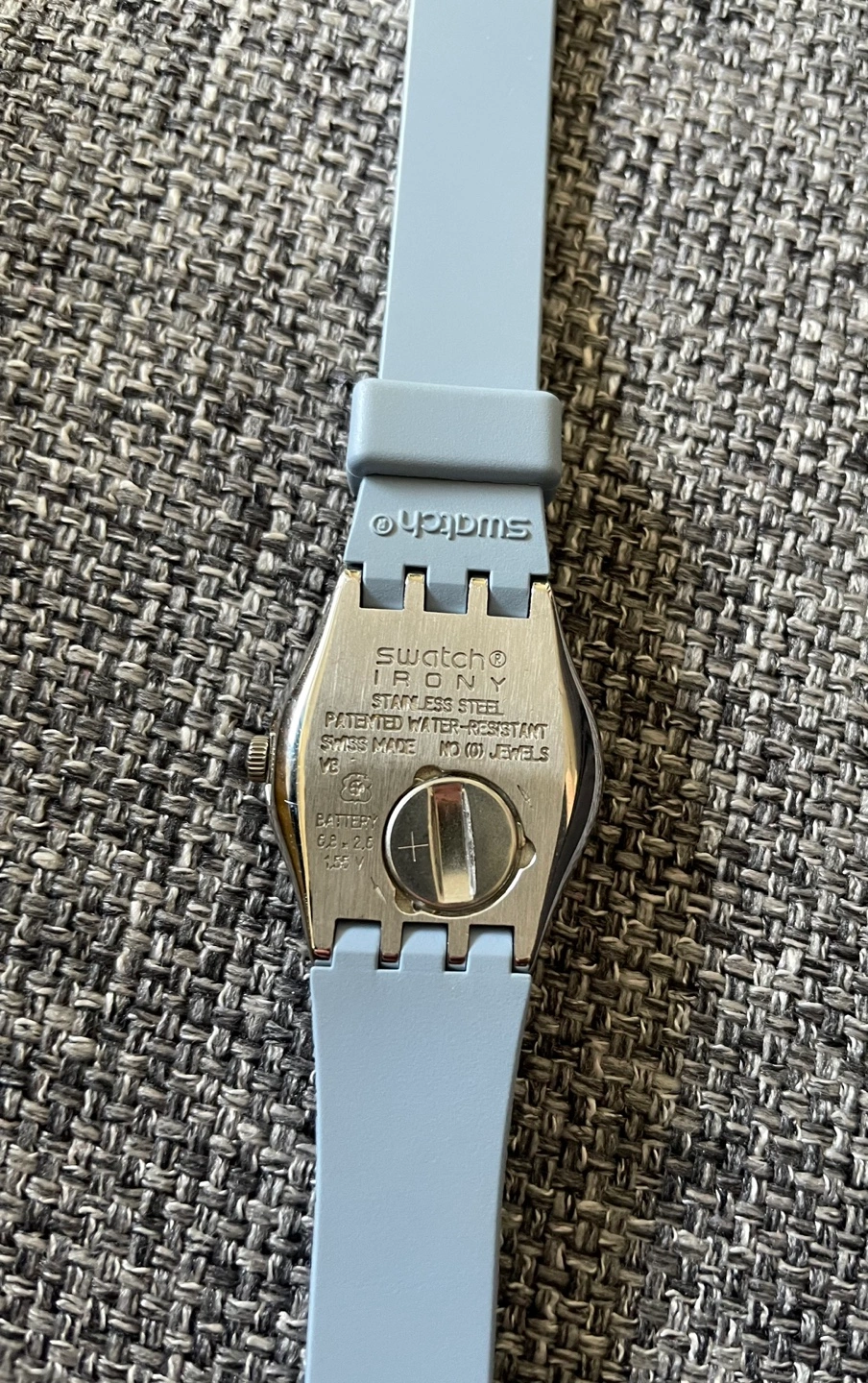 20Selling a Swatch Irony stainless steel watch! It features a light blue band and a stainless steel case. The watch is also patented water-resistant. Small dial, needs new battery (can get free from Swatch store)