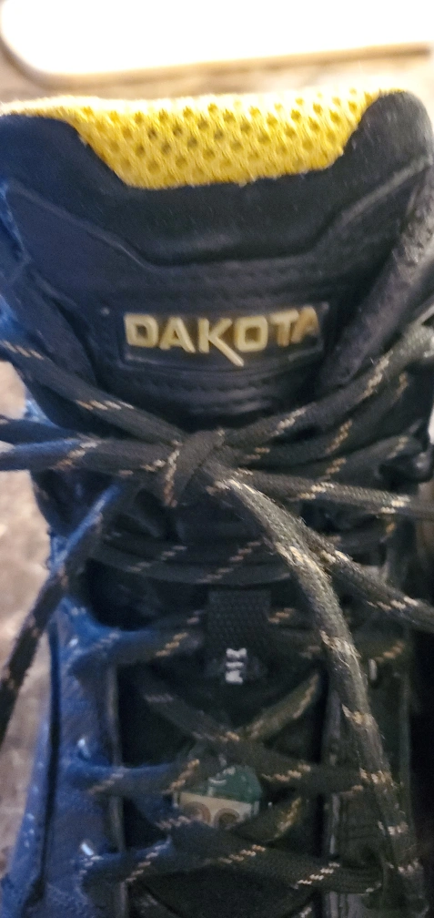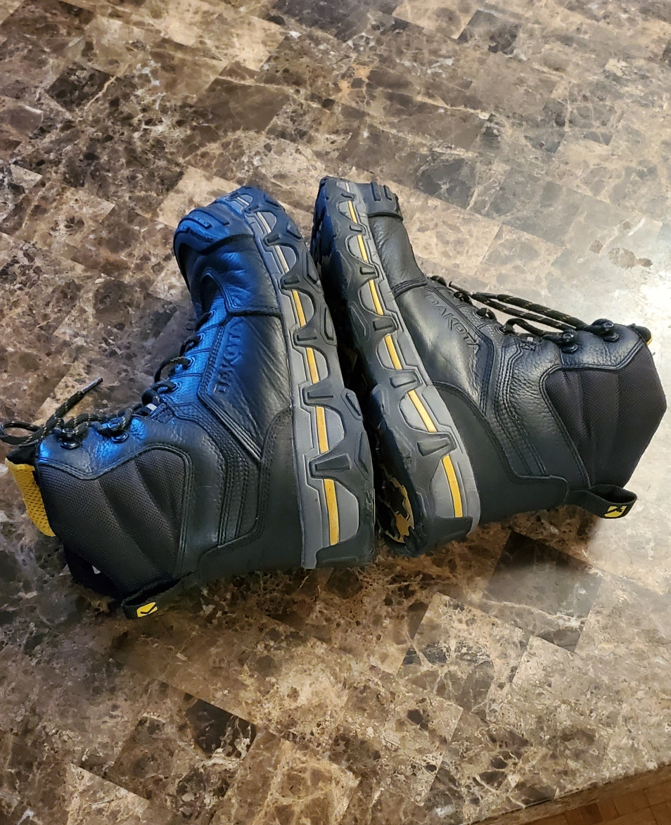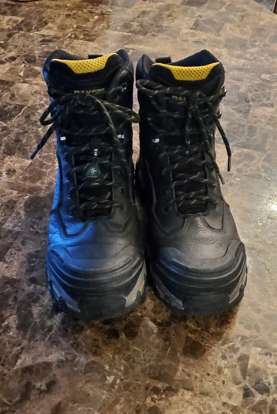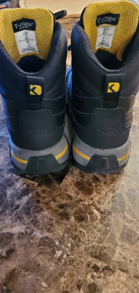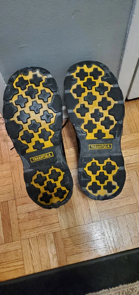 Black work boots with yellow accents and a Tarantula tread pattern.