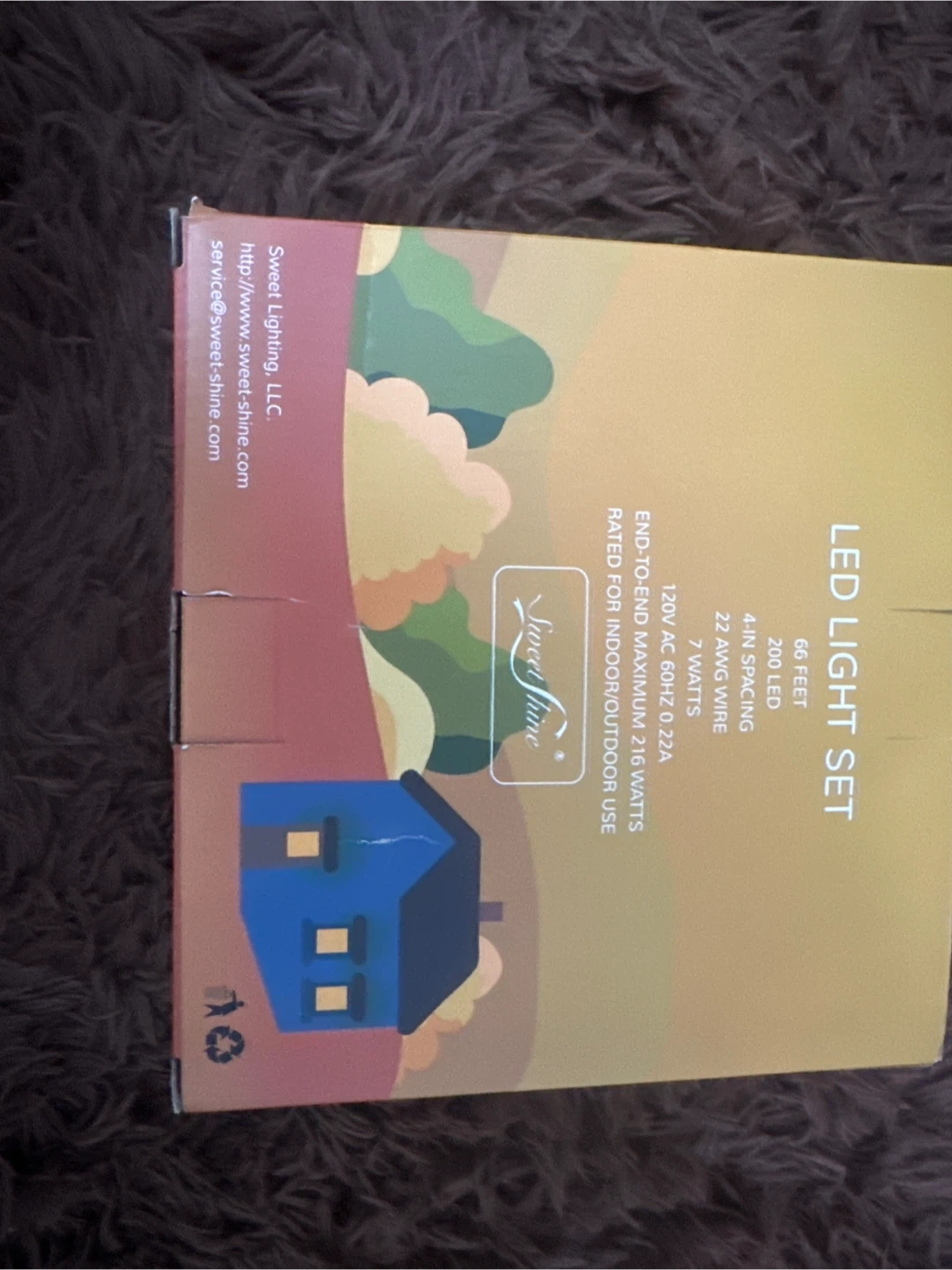 10Selling a set of Sweet Shine LED string lights. These are commercial grade lights, perfect for indoor or outdoor use. They are 66 feet long and have 200 LEDs with 4-inch spacing. They use 7 watts and are rated for indoor/outdoor use