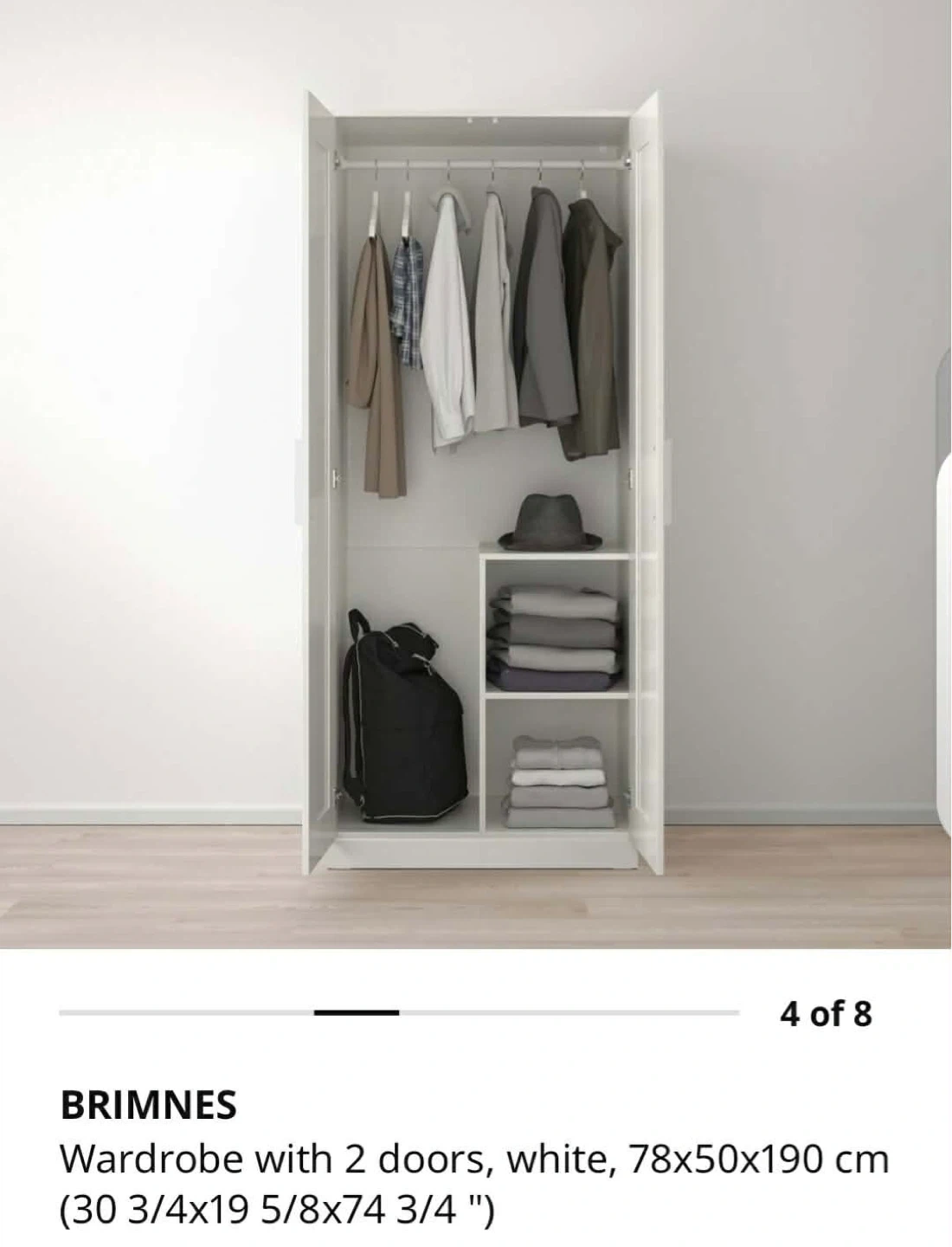 IKEA BRIMNES wardrobe. It's white and comes with two doors. Dimensions are 78x50x190 cm (30 3/4x19 5/8x74 3/4 "). It has hanging space and shelves.