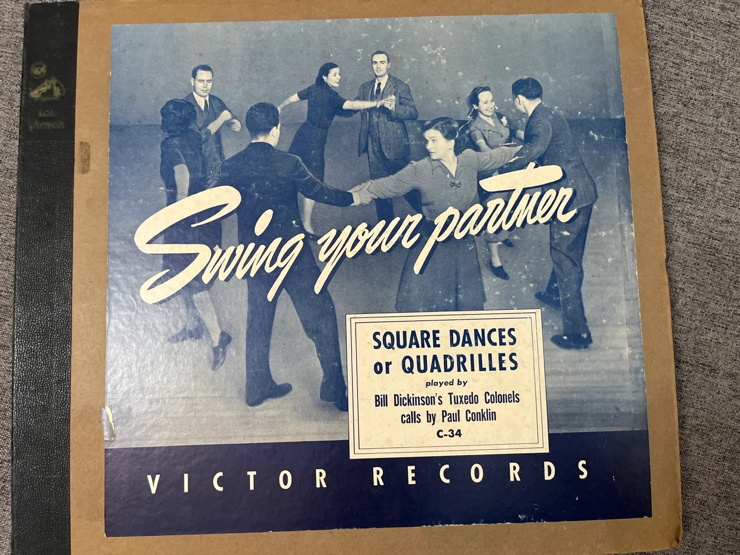 A rare vintage 78 RPM album set from the late 1940s, Swing Your Partner by Bill Dickinson’s Tuxedo Colonels with calls by Paul Conklin. Issued by Victor Records (C-34), this classic set features authentic American square dance and quadrille recordings from the post-war era. Includes multiple shellac discs in a sturdy book-style album sleeve — a true collector’s piece for fans of early folk and country dance music. Condition: Vintage Victor Records hardbound album, light wear on cover, discs visually VG condition. A great addition for collectors of 1940s Americana and early RCA Victor releases.
