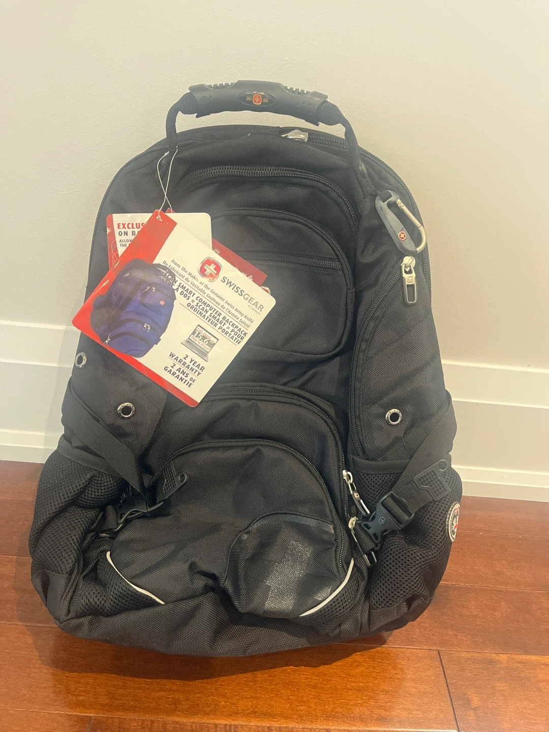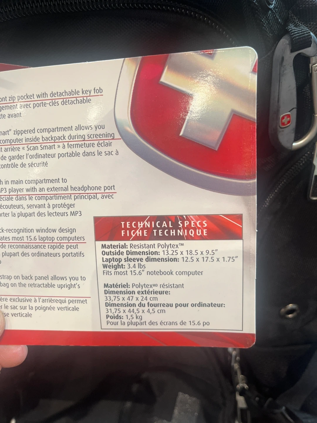 5Selling a Swiss Gear black backpack. It is made of resistant Polytex material. Here are the dimensions: - Outside: 13.25 x 18.5 x 9.5 inches - Laptop sleeve: 12.5 x 17.5 x 1.75 inches - Weight: 3.4 lbs Fits most 15.6" notebook computers