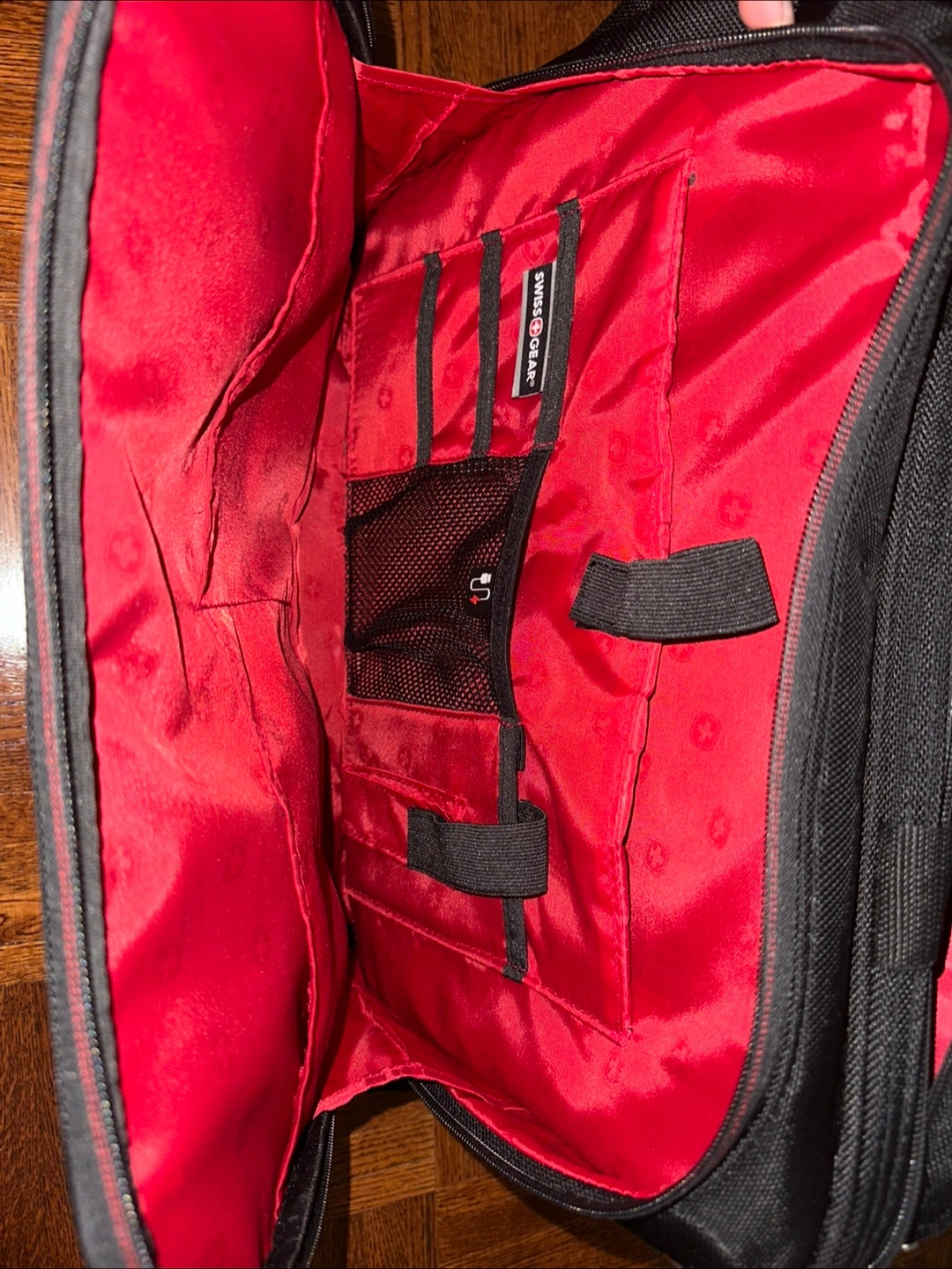 Looking to sell a Swiss Gear laptop bag in great condition! It's black on the outside with a vibrant red interior. Lots of compartments for organizing your things. Perfect for work or school!