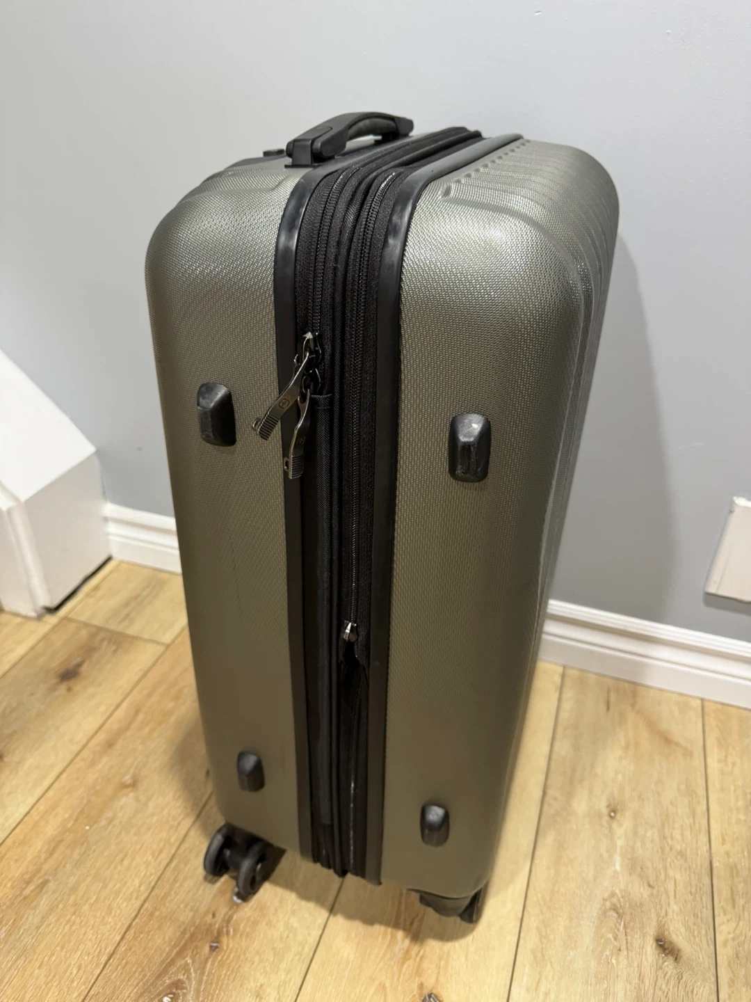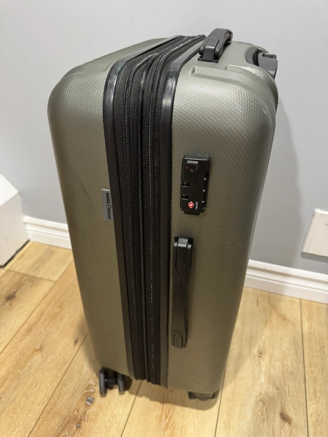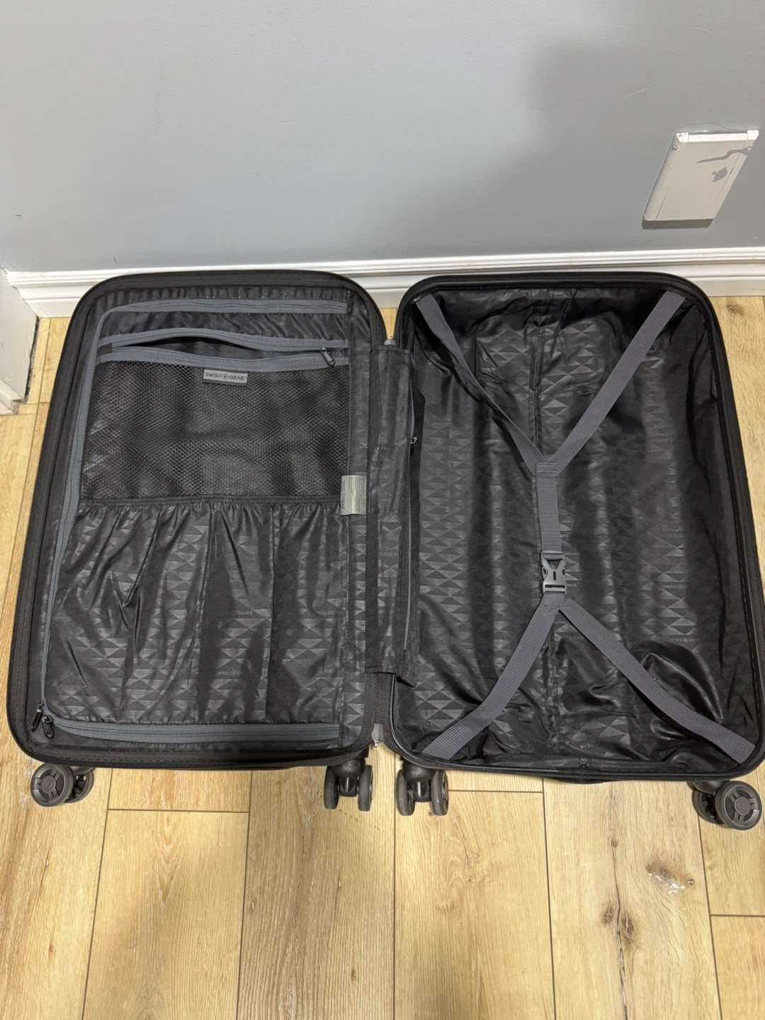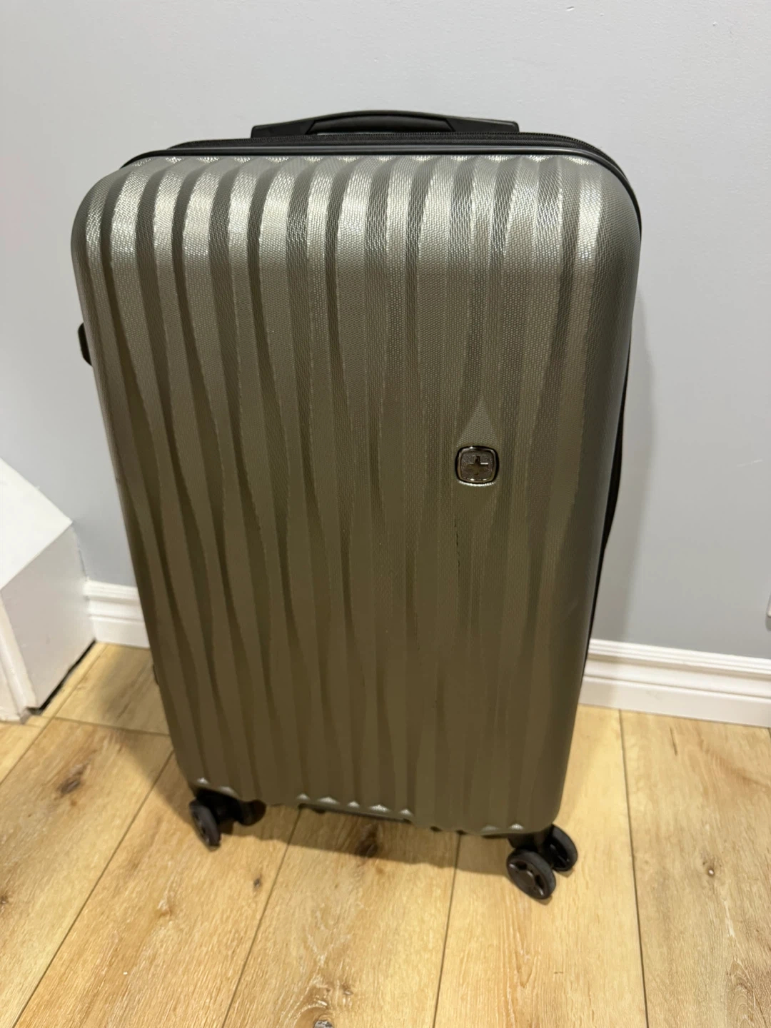 32For sale is a Swiss Gear suitcase, perfect for your travel needs. This suitcase features a hard shell, four wheels for easy maneuverability, and a retractable handle. It has a TSA lock. It's in good condition and fully functional, ready for your next adventure. One zipper tab is missing but the zipper works perfectly fine! * Hard shell * Four wheels * Retractable handle * TSA lock Size: 26” x 16” x 11” Don't miss out on this fantastic deal! And just so we're clear, if the ad's still up, it's still up for grabs!