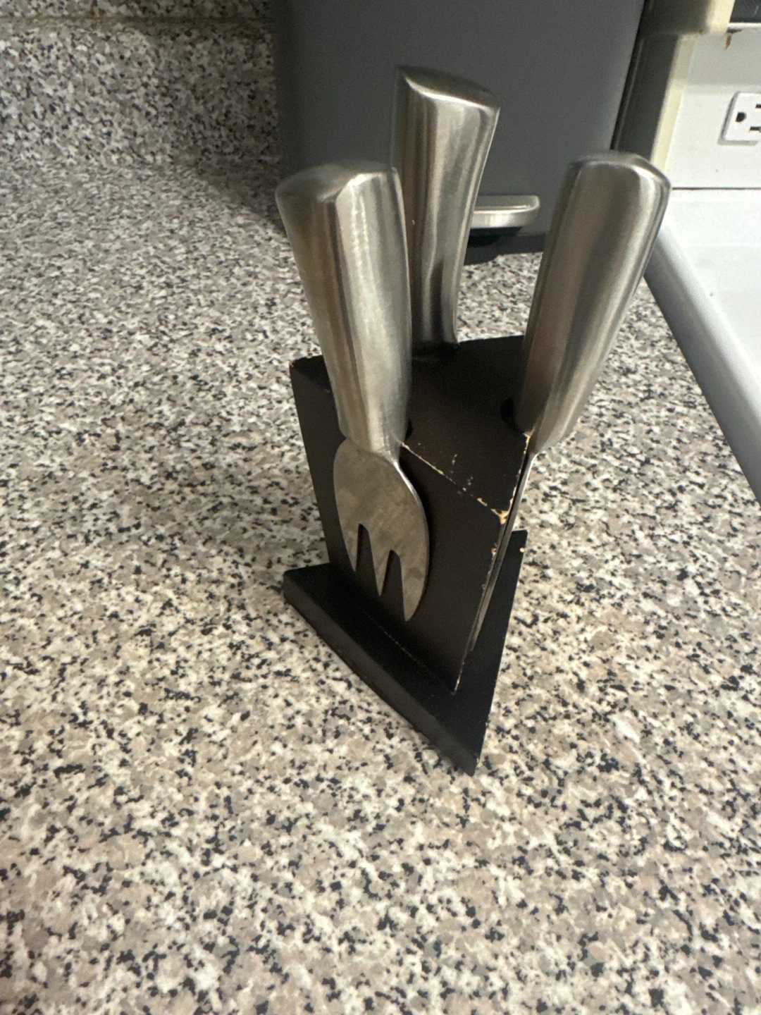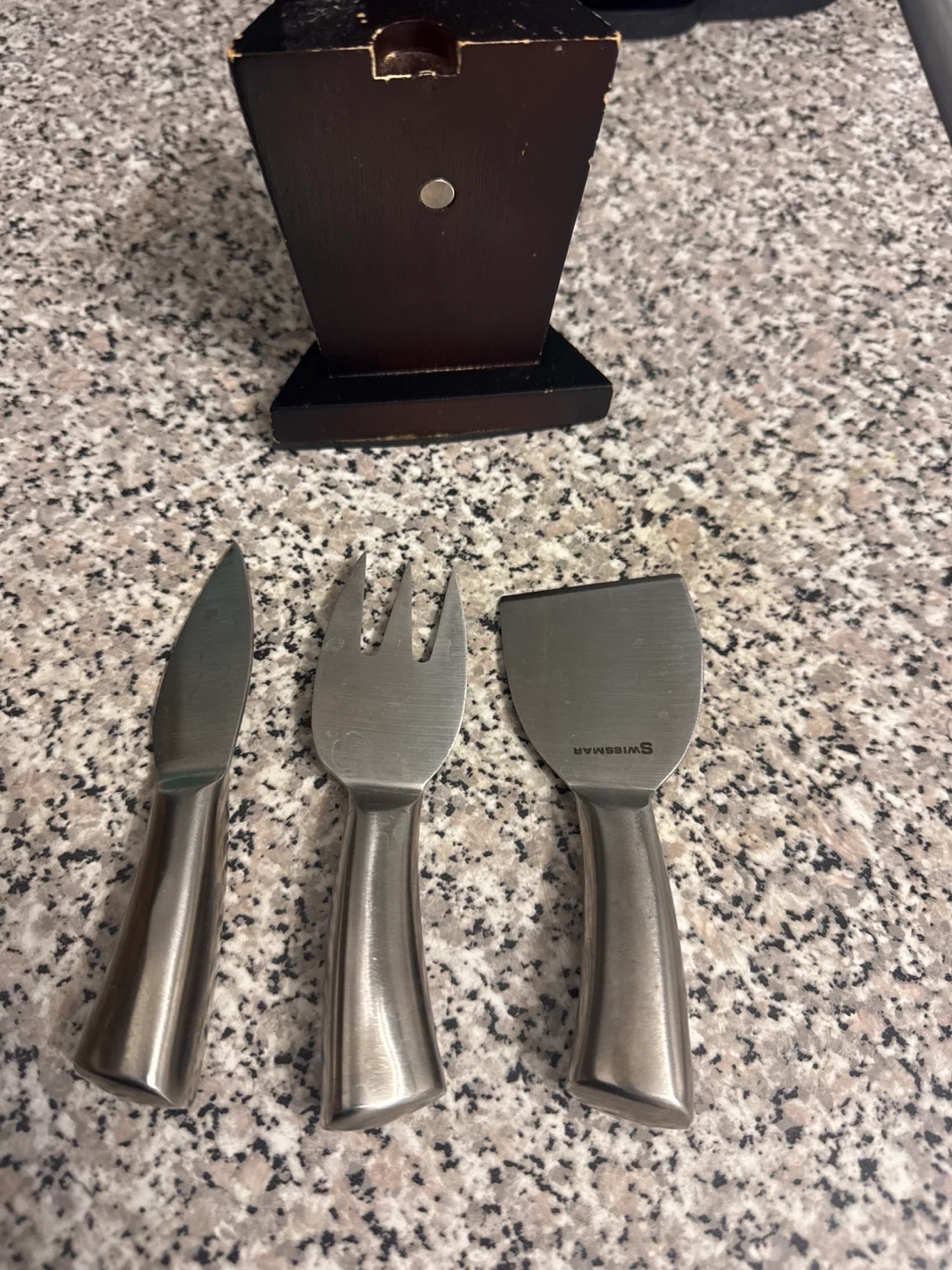 Selling a Swissmar cheese knife set. It comes with a wooden stand and three stainless steel cheese knives, including a cheese knife, cheese fork, and cheese spreader. Great for entertaining!