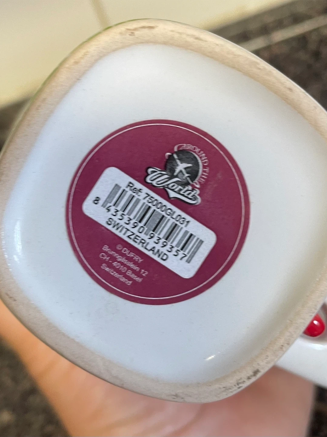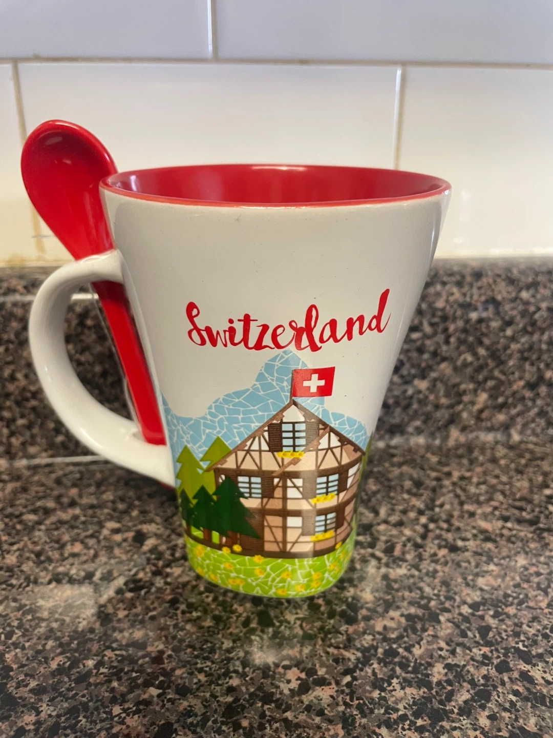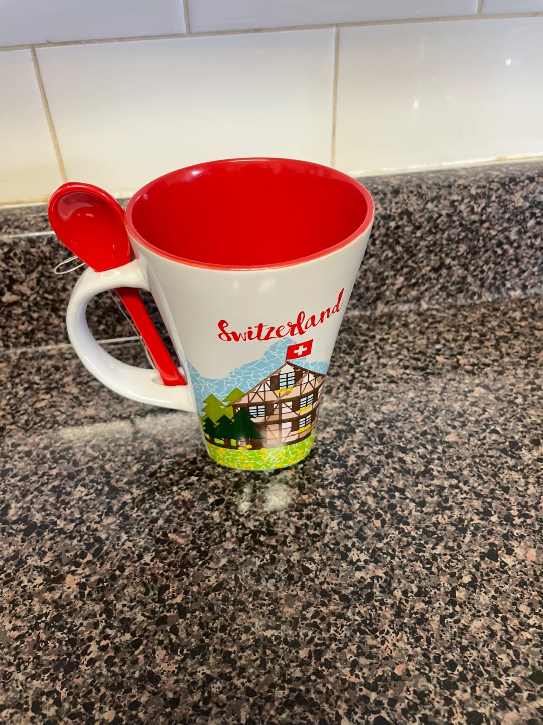 92Cute Switzerland mug with a matching red spoon! It features a charming Swiss chalet design. Perfect for adding a touch of Swiss flair to your morning coffee or tea