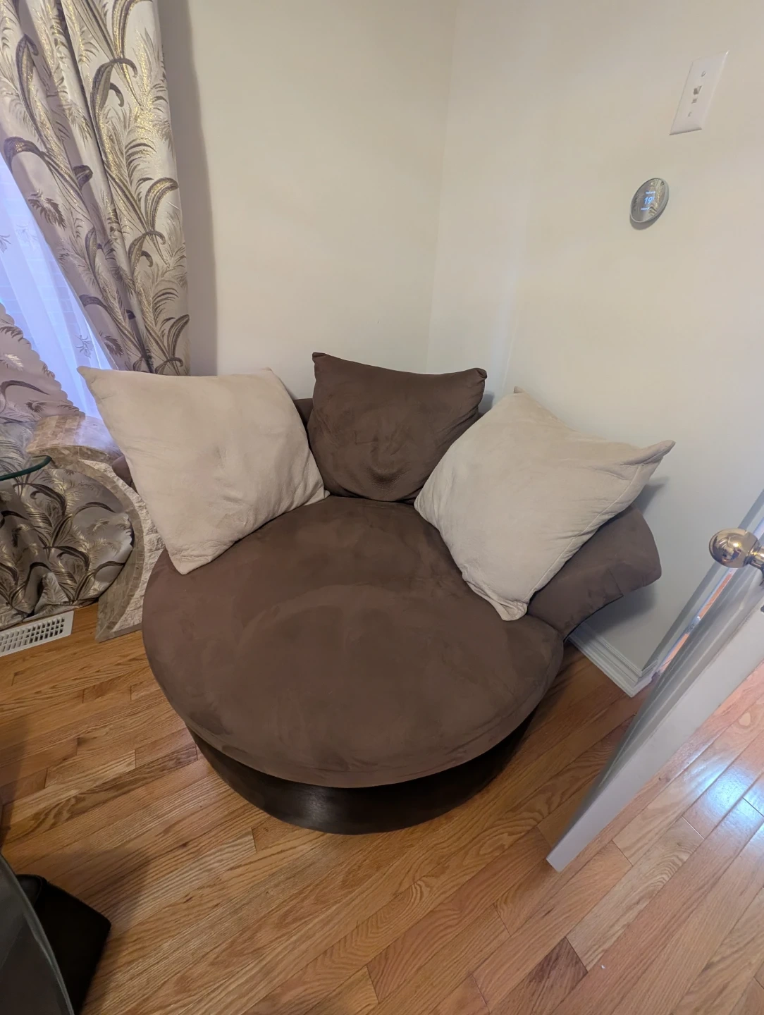 10Cozy swivel accent chair in a lovely brown colour! It's in great condition and would be a perfect addition to any living space