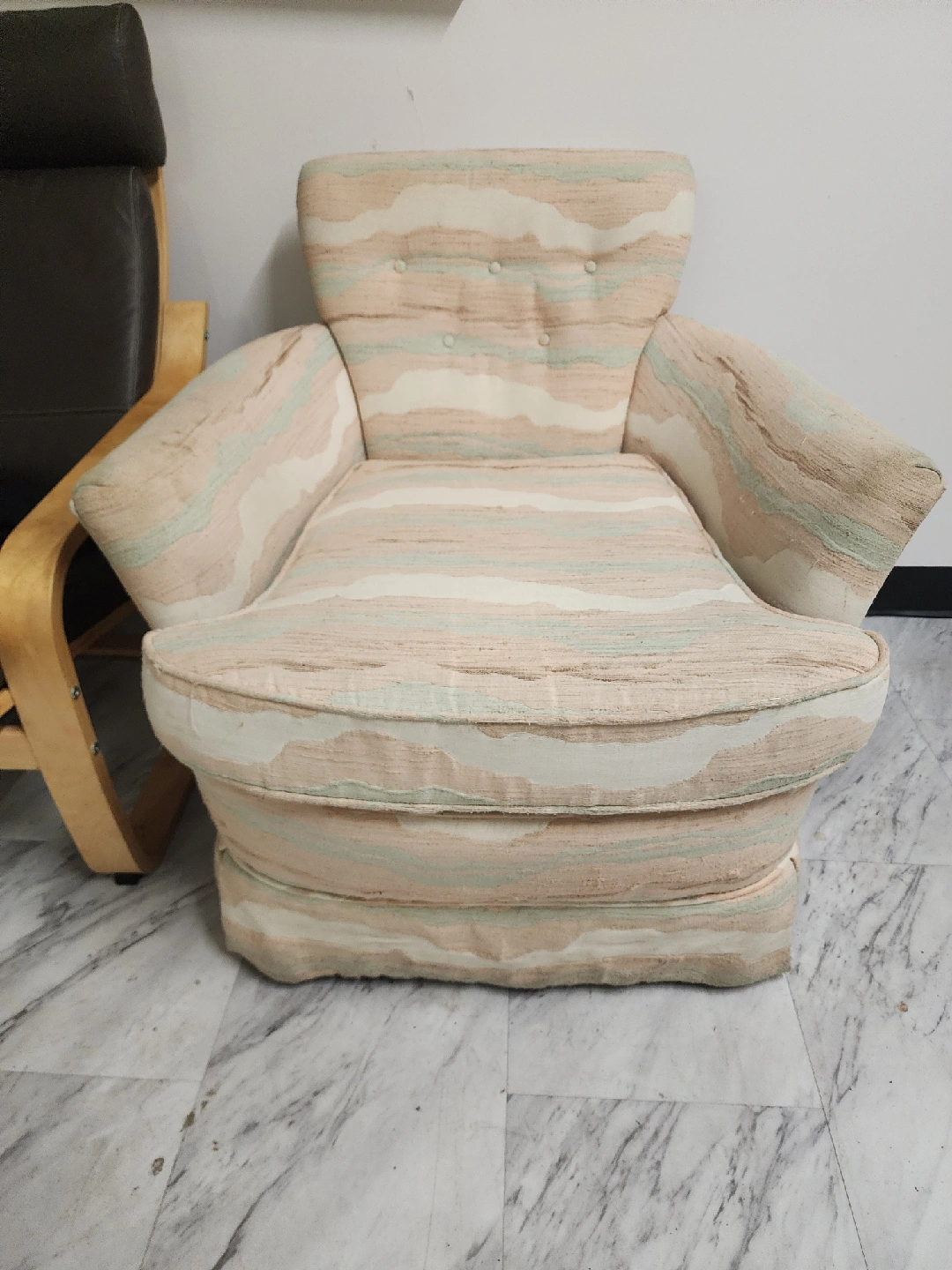 Selling a comfy swivel armchair with a unique, eye-catching pattern! It's perfect for adding a touch of style to any room. The chair features a rounded base and a button-tufted back. It's in good condition and ready for a new home