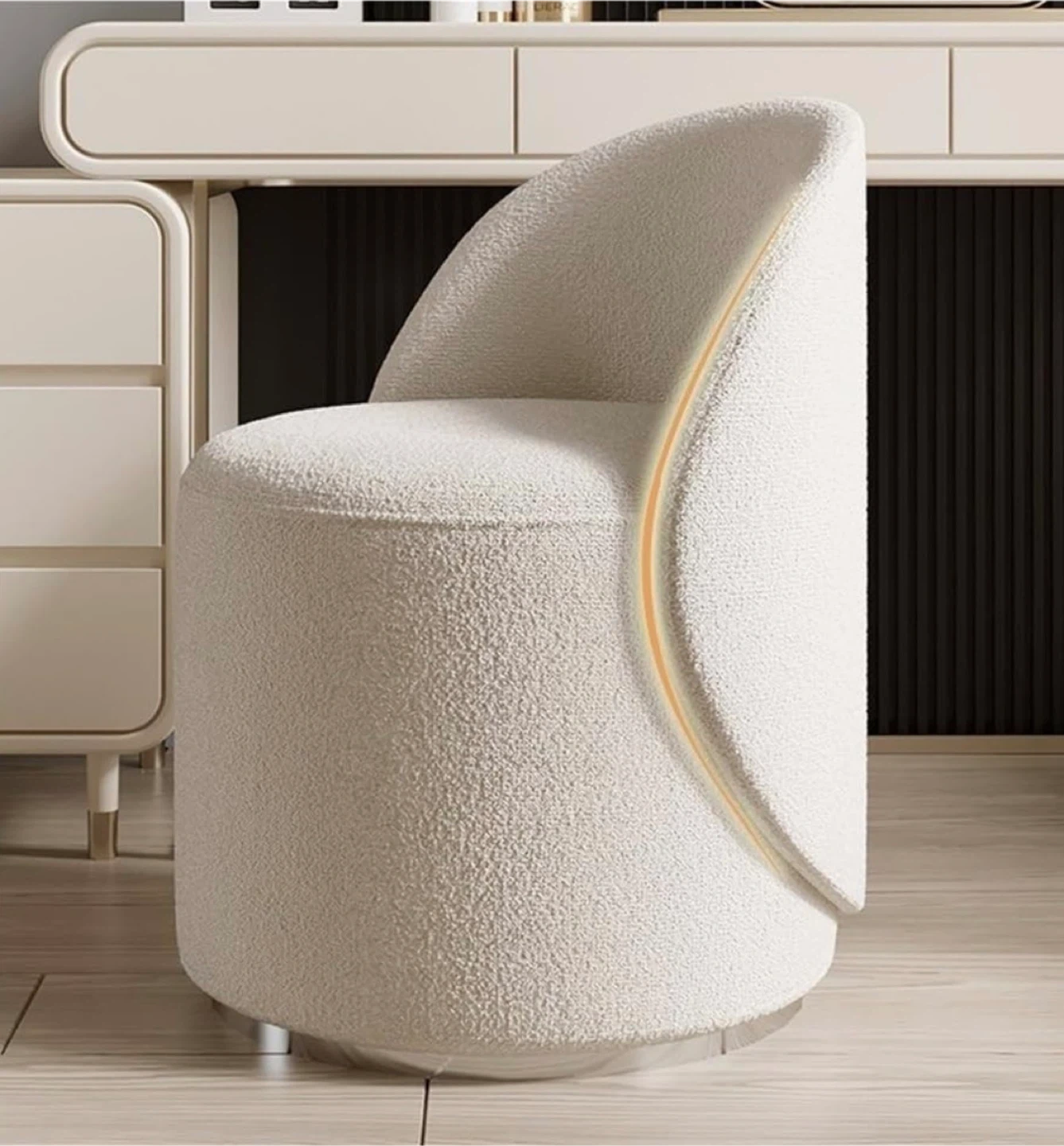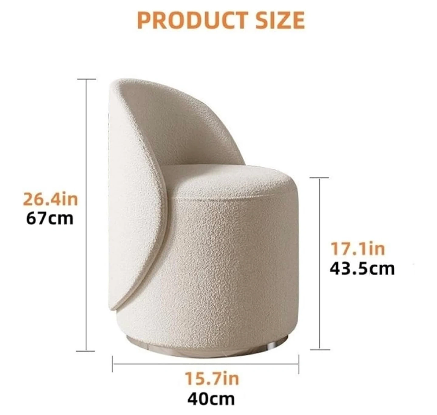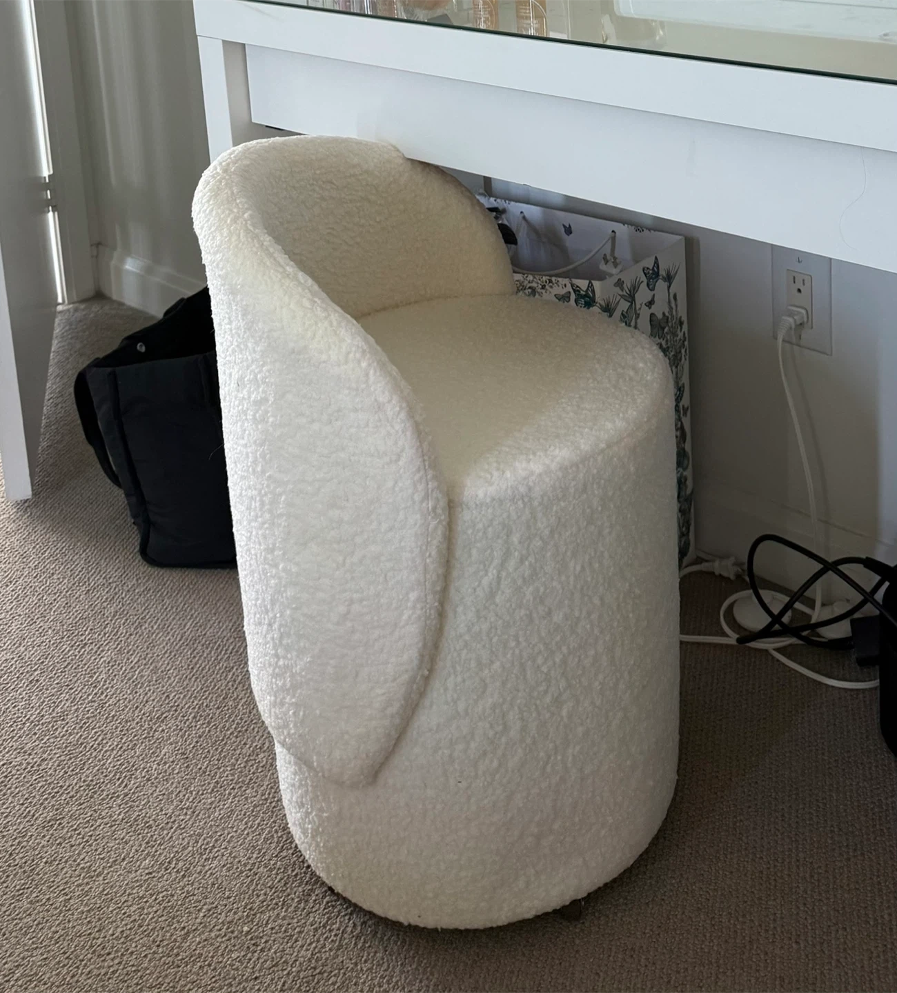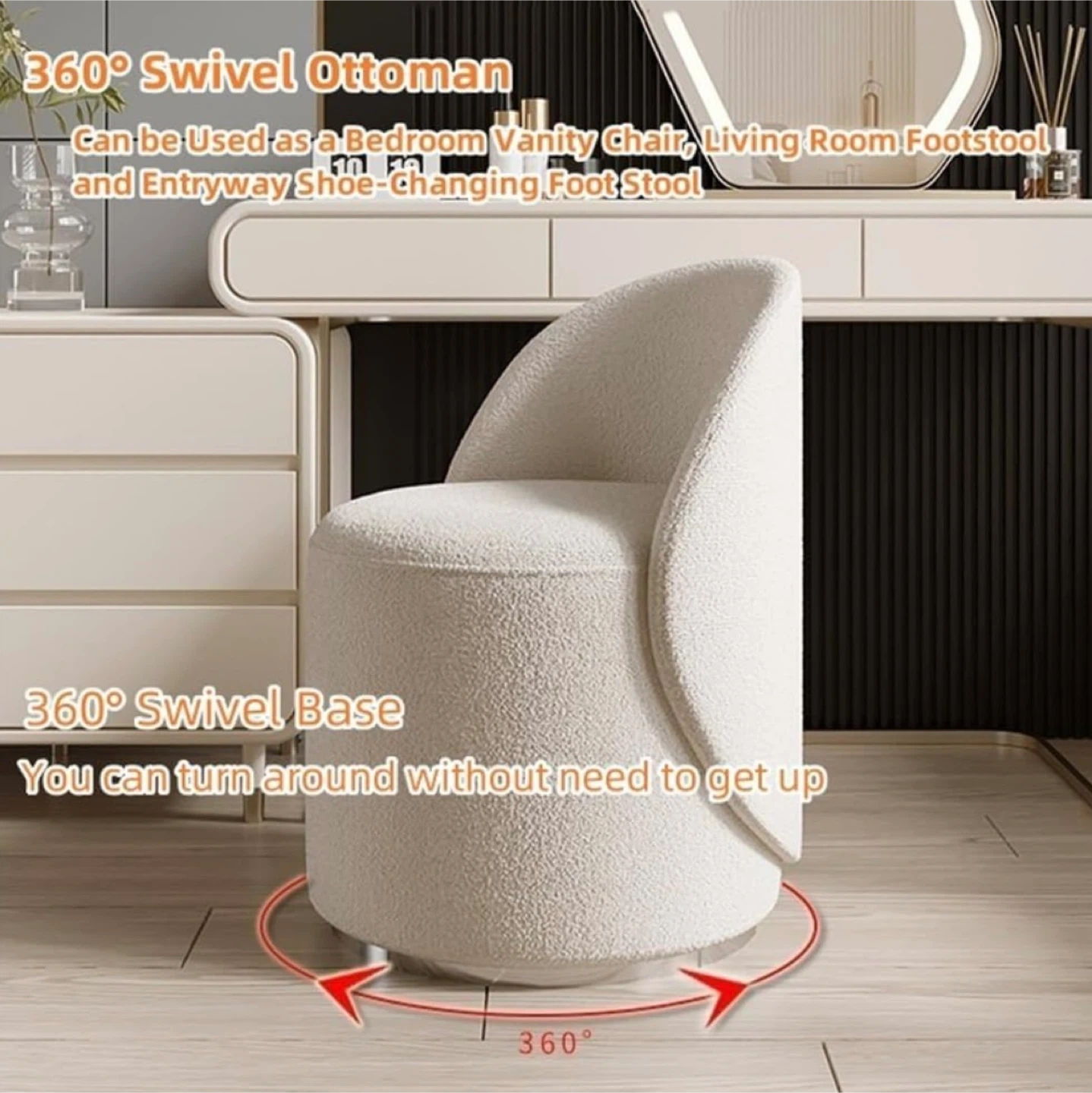 Selling a super cute swivel ottoman vanity chair! It's in brand new still wrapped in packaging and would be perfect for a bedroom vanity or as a unique footstool in a living room or entryway. The 360° swivel base lets you turn around without needing to get up. It's about 26.4 inches (67cm) tall, 17.1 inches (43.5cm) wide, and 15.7 inches (40cm) in diameter. Such a stylish and comfy piece!