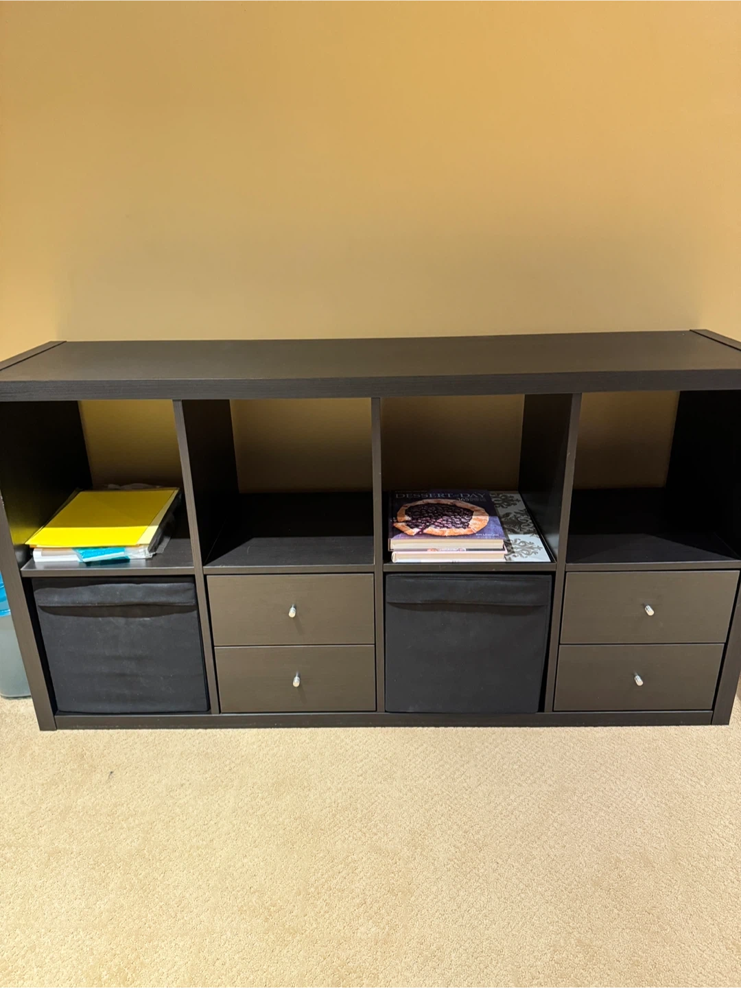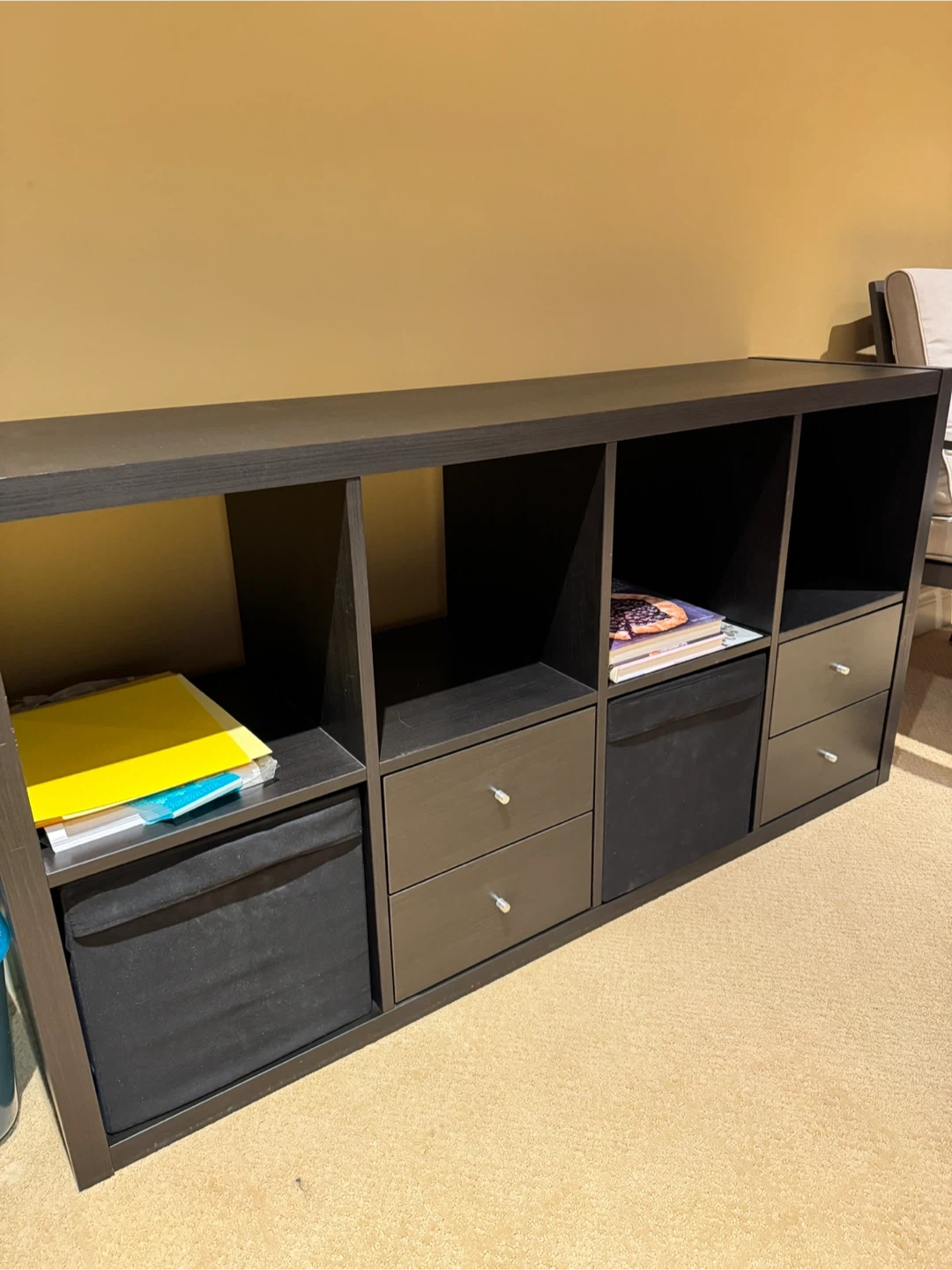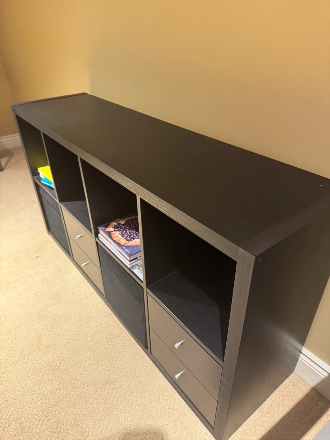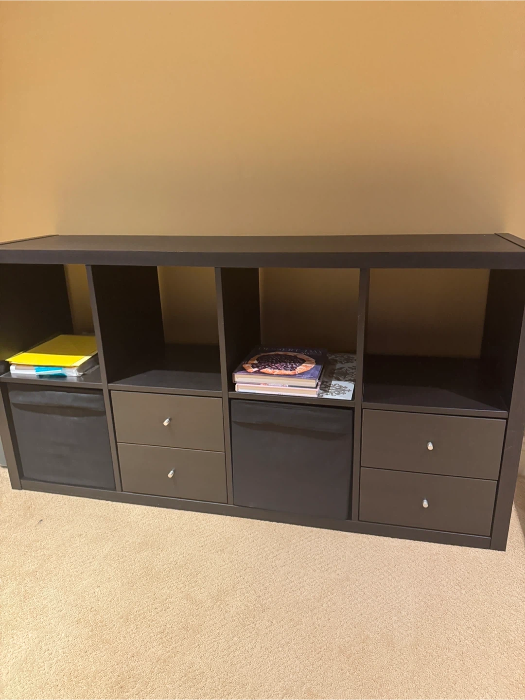 This is a IKEA versatile cube storage unit in a dark brown finish. It features 4 open cube spaces, 2 fabric storage cubes, and 4 drawers with silver knobs. It's great for organizing books, toys, or other household items. Dimensions: 76cmH x 146.5cmW x 39cmD