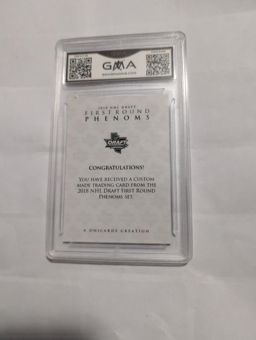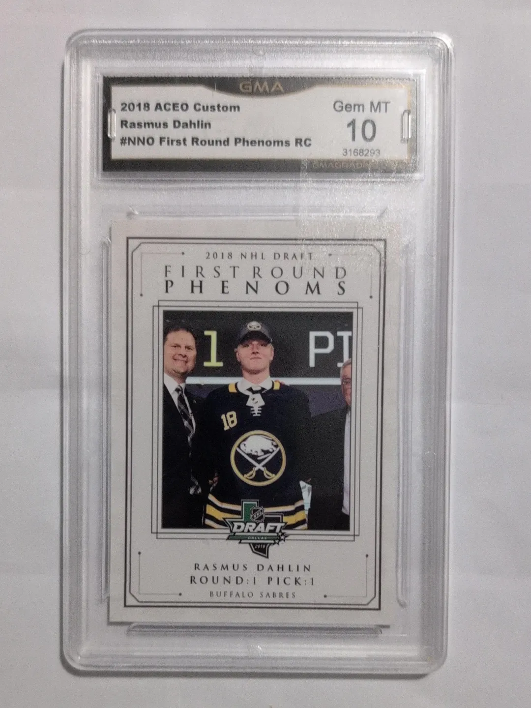 This is a 2018 ACEO Custom Rasmus Dahlin trading card, part of the First Round Phenoms set. It's a custom-made trading card from the 2018 NHL Draft First Round Phenoms set. The card is graded Gem MT 10 by GMA.