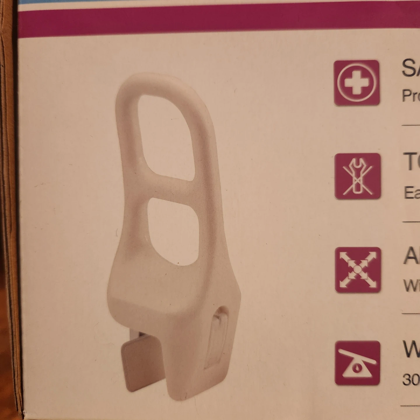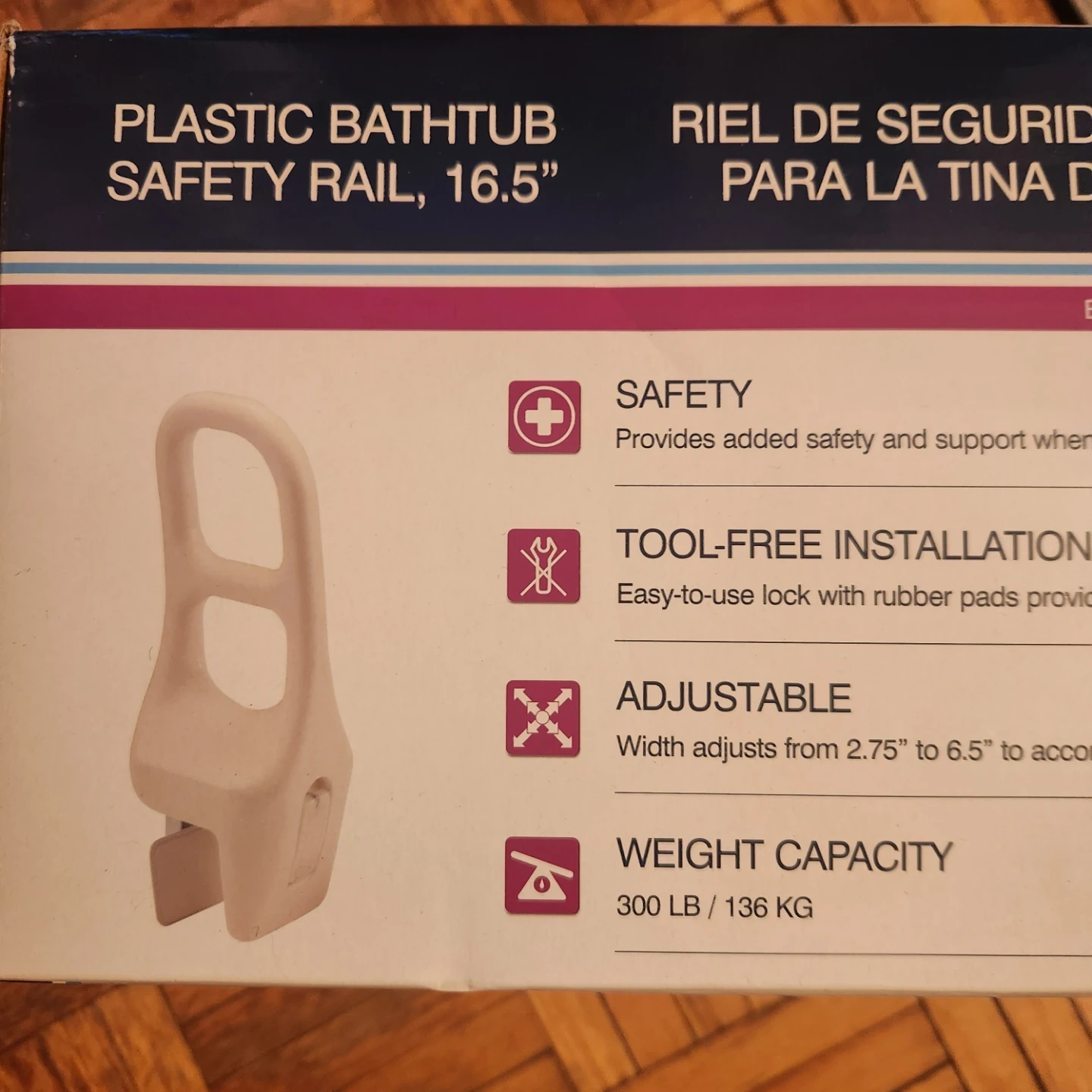 This bathtub safety rail provides added safety and support when entering and exiting the tub. It features tool-free installation with rubber pads for stability and scratch protection. The width is adjustable from 2.75" to 6.5" to fit most tubs. It has a weight capacity of 300 LB / 136 KG.