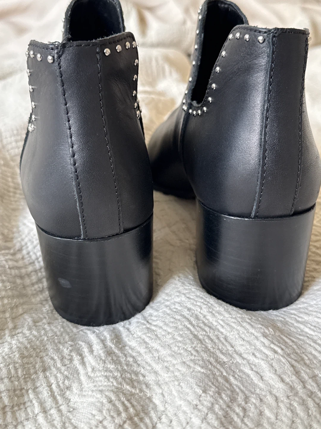 These black ankle boots are made of leather and feature stud detailing along the top edge. They have a pointed toe and a block heel. Great for adding a little edge to any outfit!