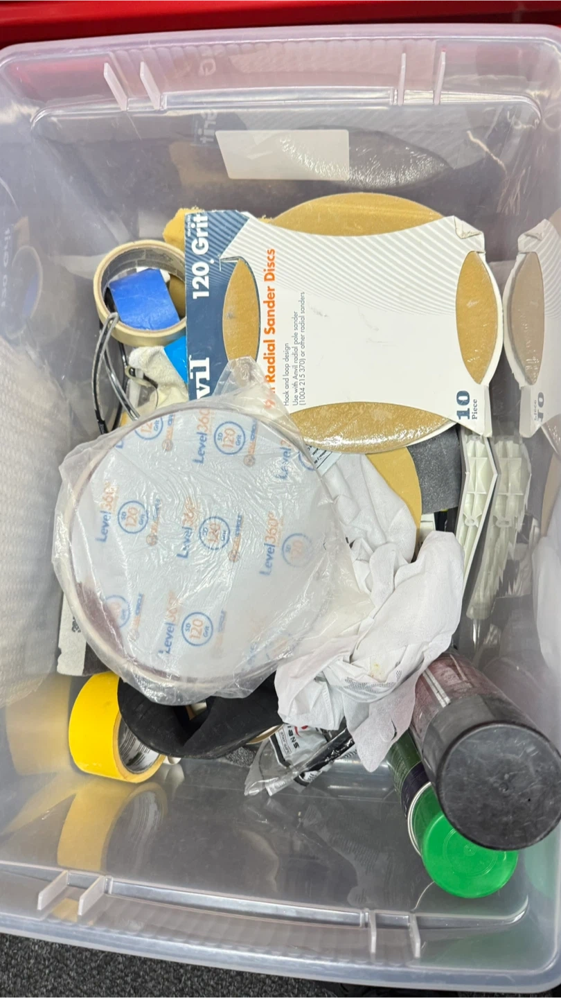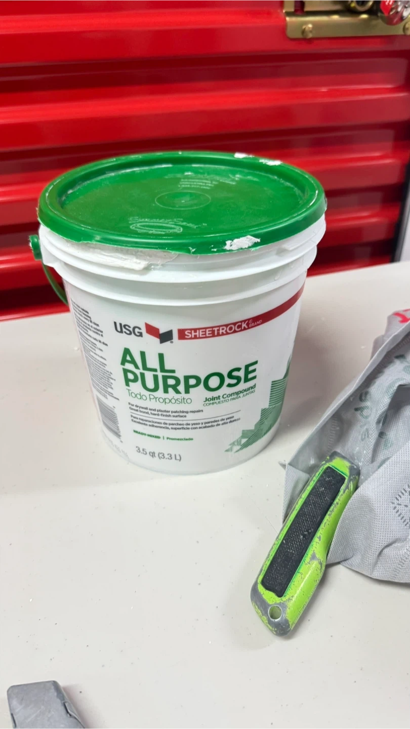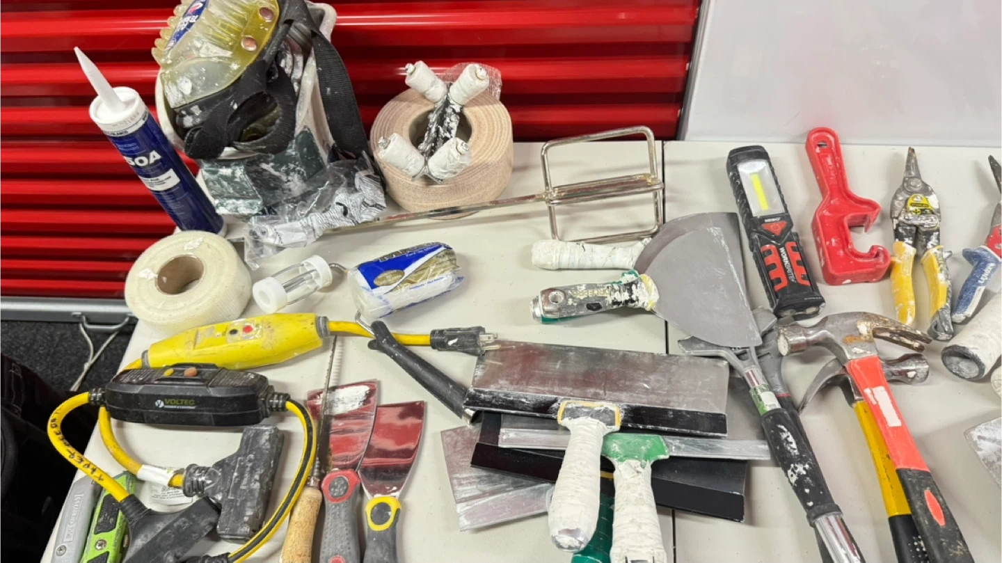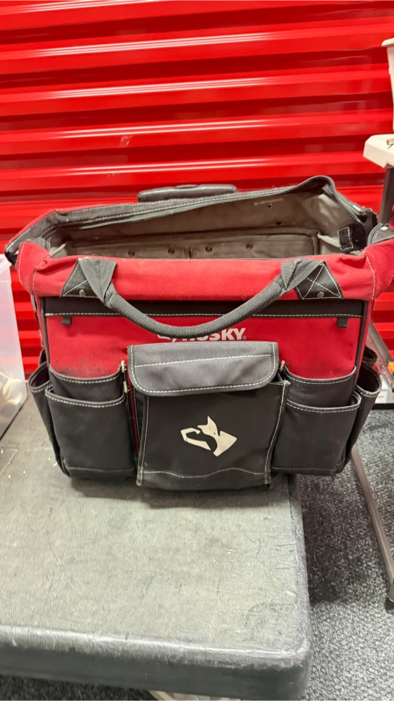 This lot includes a Husky tool bag filled with various drywall tools and accessories. You'll find multiple putty knives, a hammer, pliers, cutters, and a caulking gun. It's a great starter set for any drywall project!