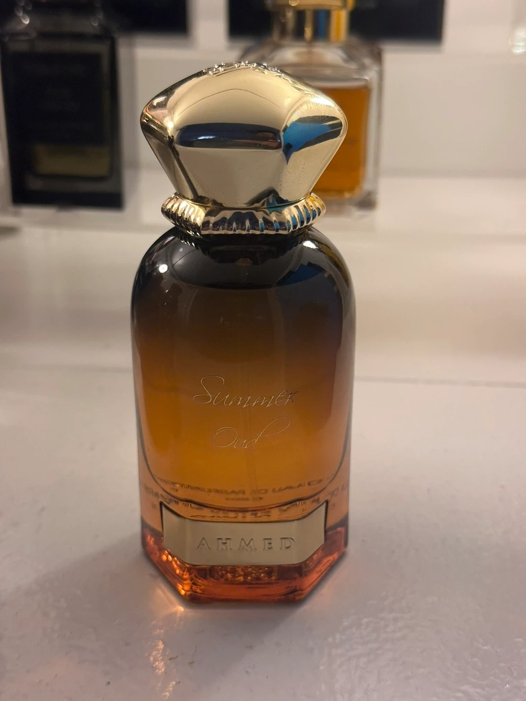 Selling a bottle of Ahmed Summer Oud perfume. The bottle has a beautiful gradient from dark to light amber, and a shiny gold cap. Perfect for the winter