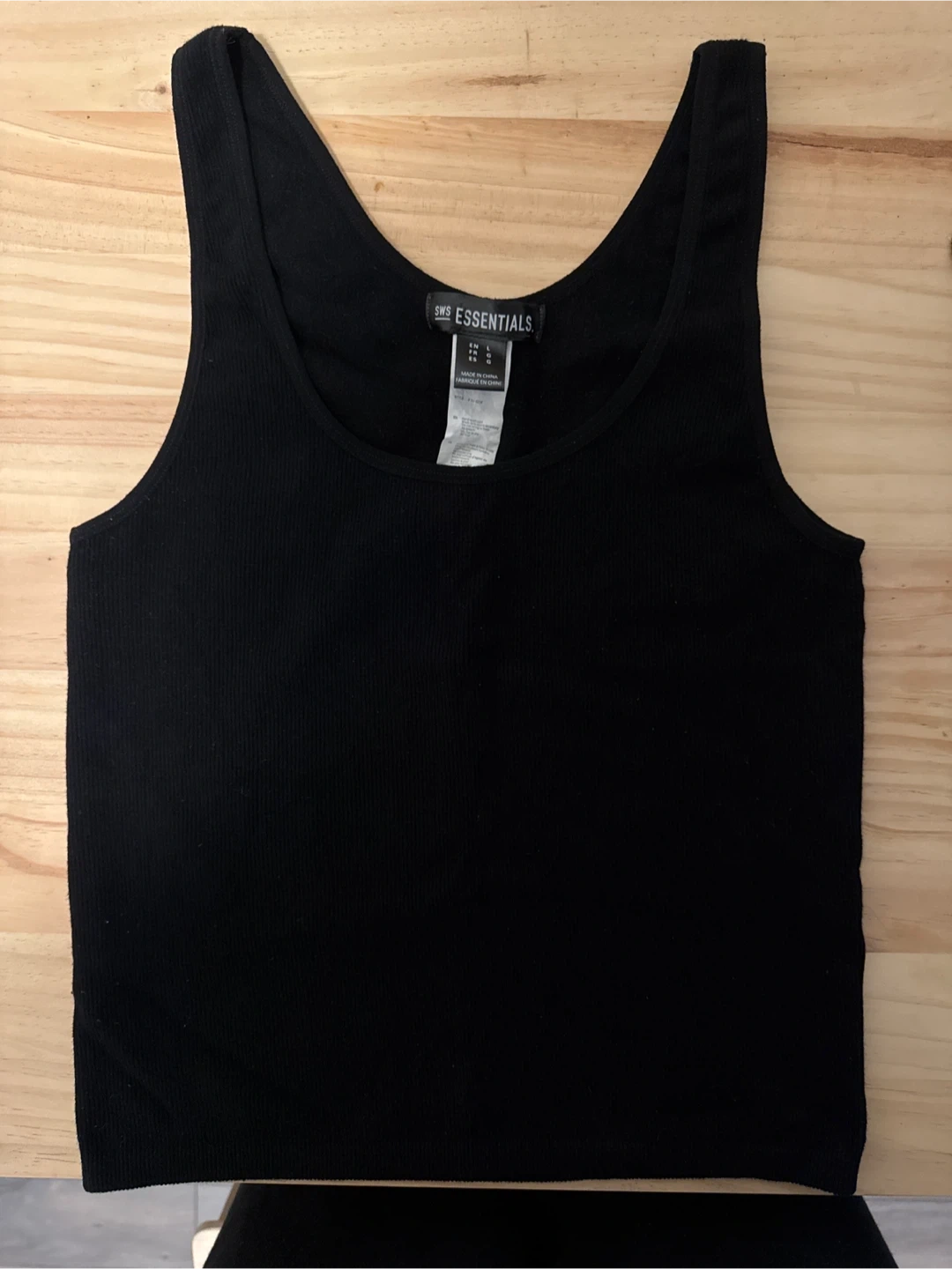 81A simple and versatile black tank top from SWS Essentials! It's a size large and very stretchy. It’s made from a comfy blend of 66% rayon, 30% nylon, and 4% spandex. Perfect for layering or wearing on its own!