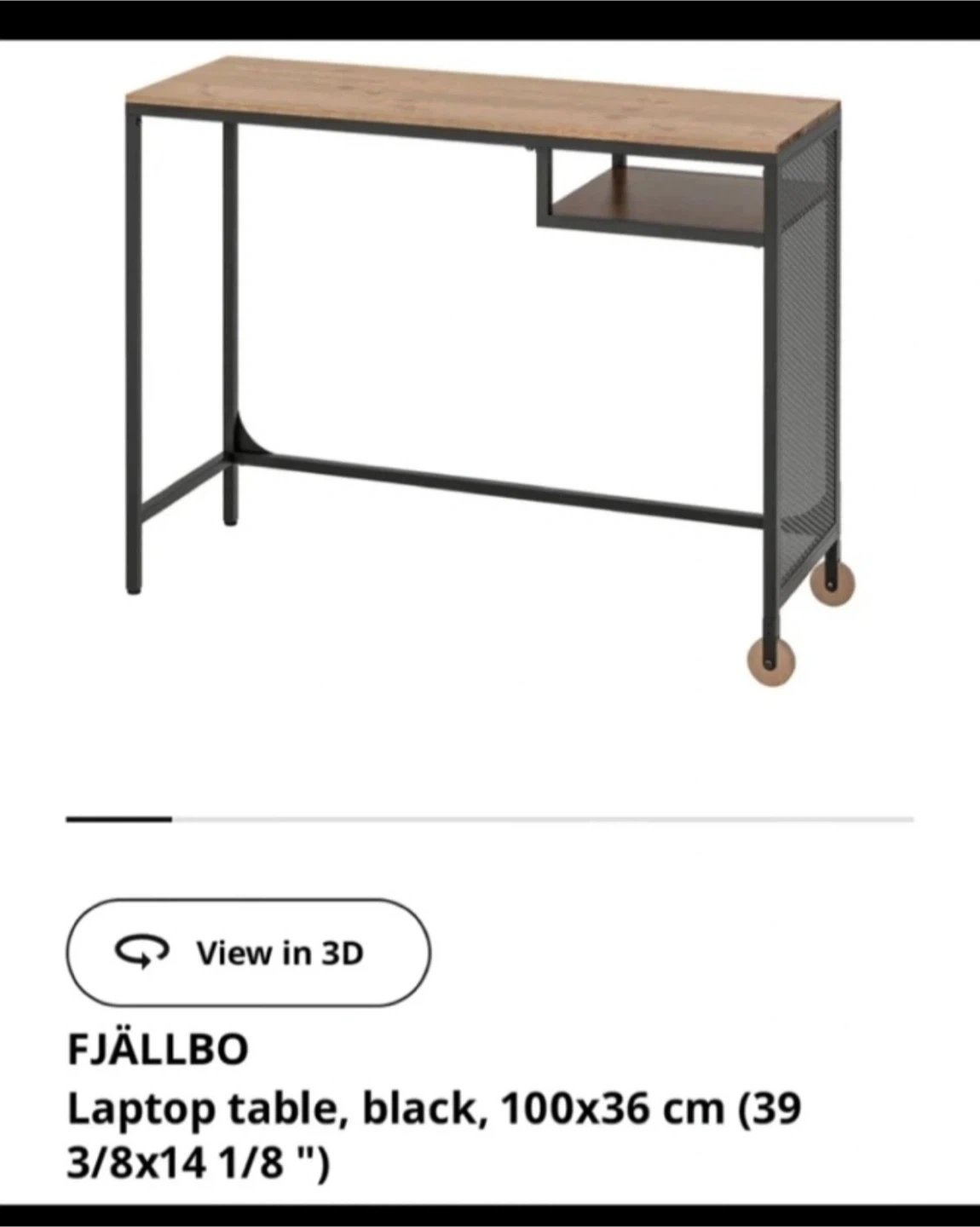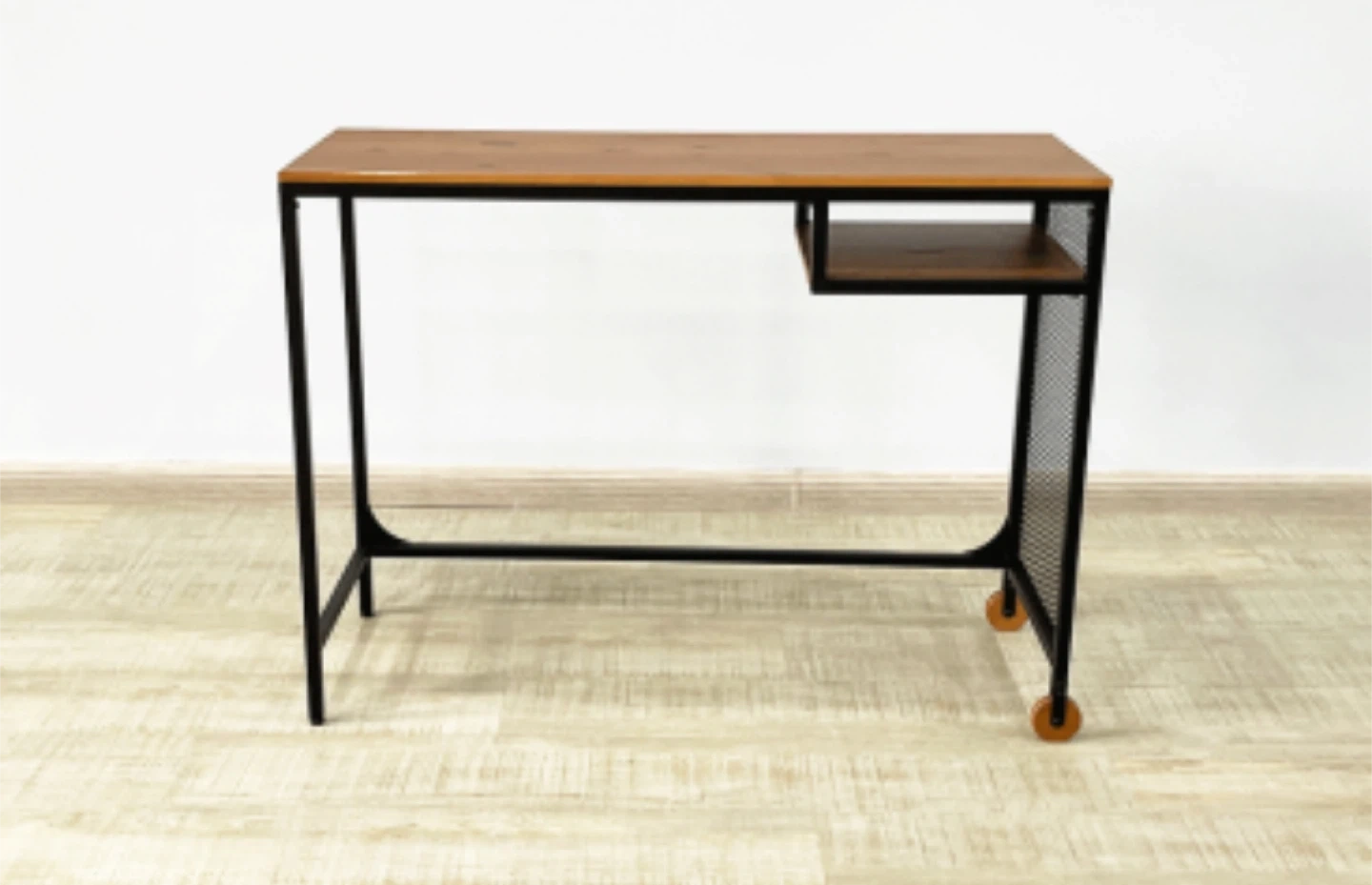 This desk features a brown wood top with a black metal frame. It includes a mesh side panel and two rolling wheels for mobility. Additional shelf on the side.