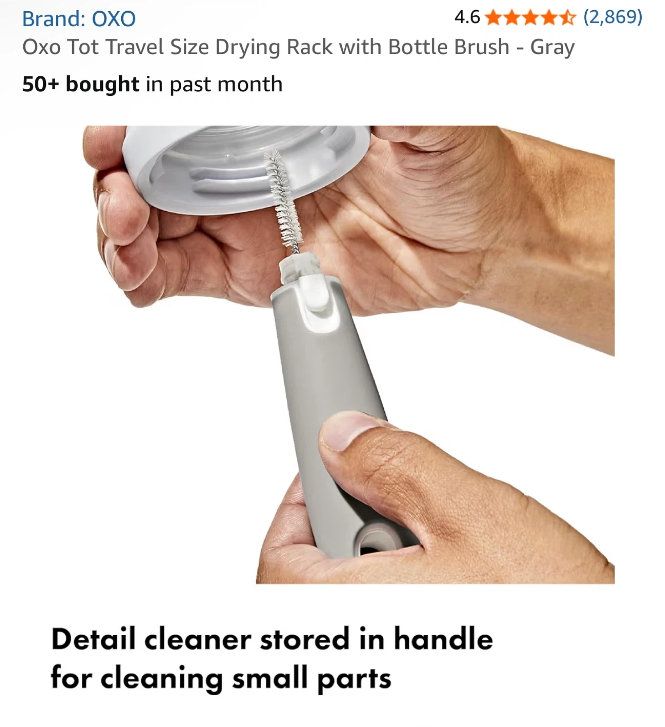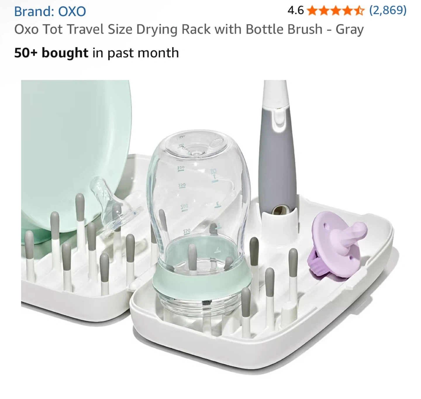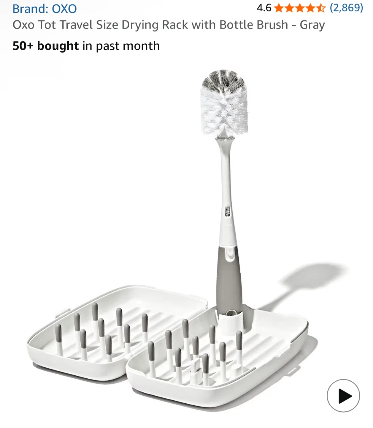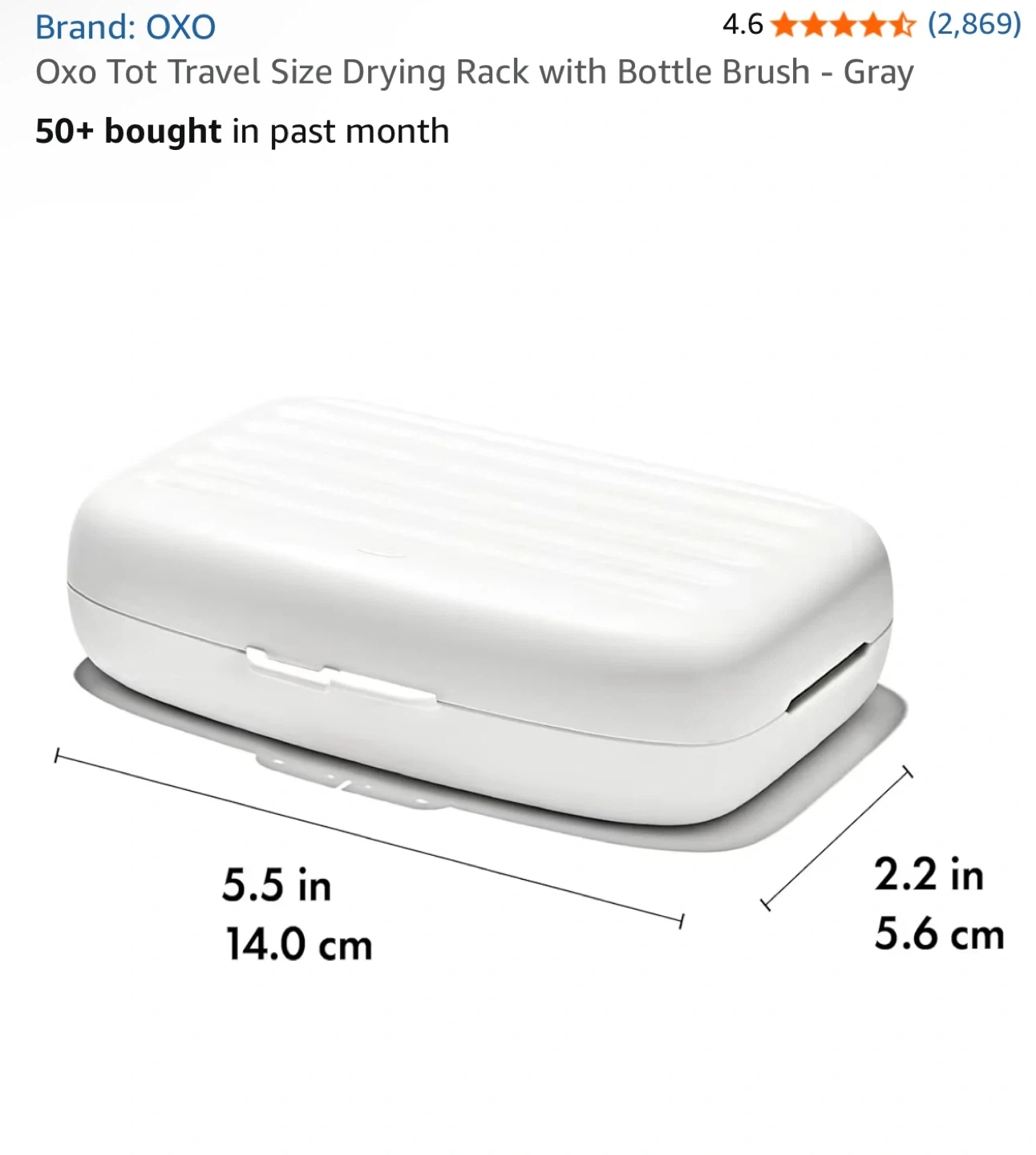 I'm selling an OXO Tot Travel Size Drying Rack with Bottle Brush in Gray. It's perfect for keeping your baby bottles and accessories clean on the go! The brush comes apart for easy storage in the rack, and there's even a detail cleaner stored in the handle for cleaning small parts. Dimensions are 5.5 in x 2.2 in x 5.6 cm.