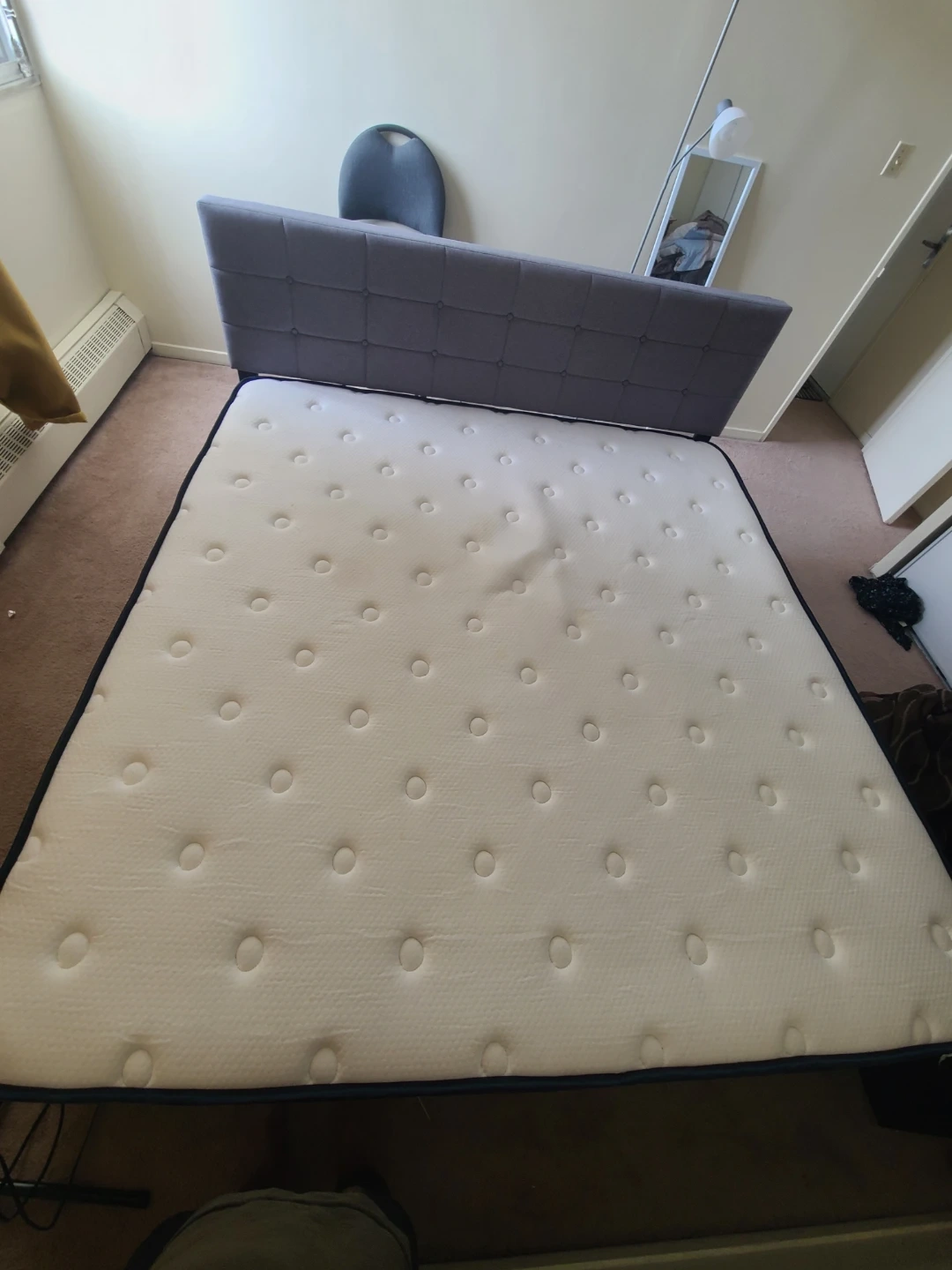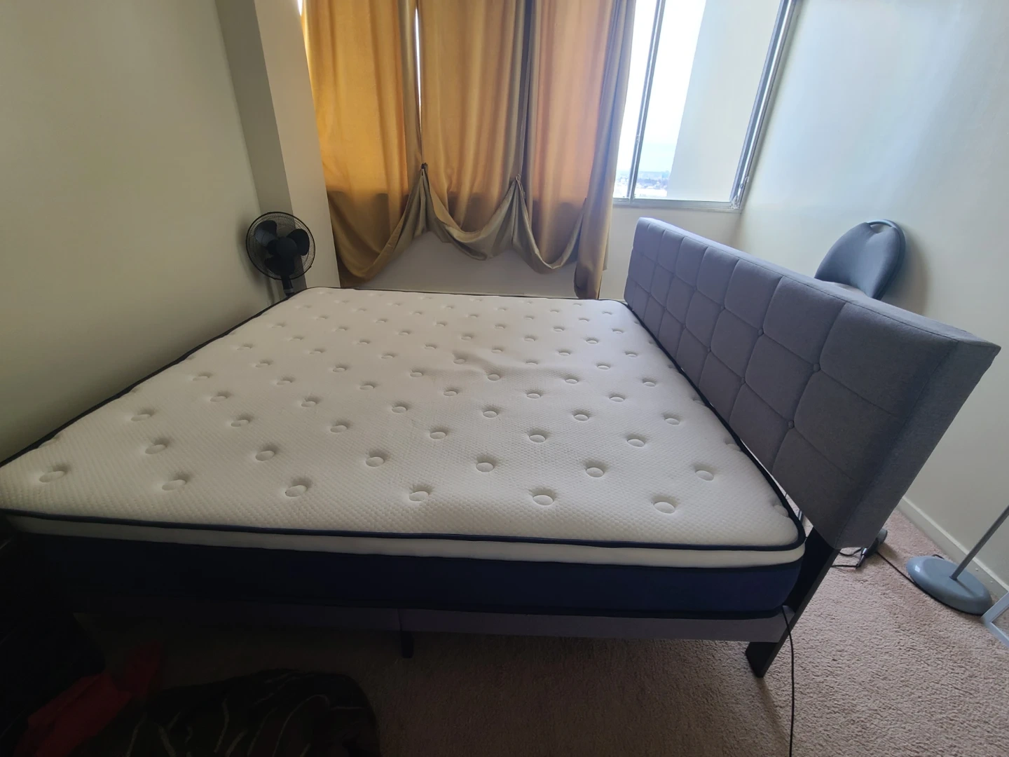 King size bed frame featuring a stylish tufted grey headboard. It comes with a comfortable mattress. The frame is sturdy and ready for use.