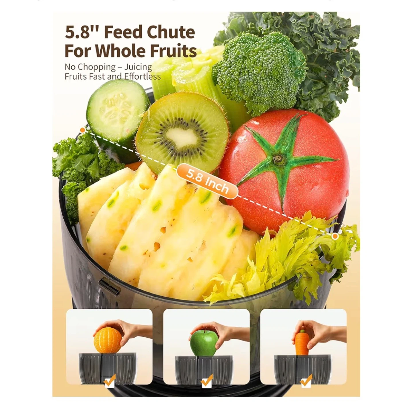 This Zachvo slow juicer is designed for real people and real kitchens. It has a 148mm wide chute and an easy-clean design. It's great for making fruit juice and frozen treats, turning fruit into creamy, spoonable desserts and cold-pressed juice with rich nutrients.