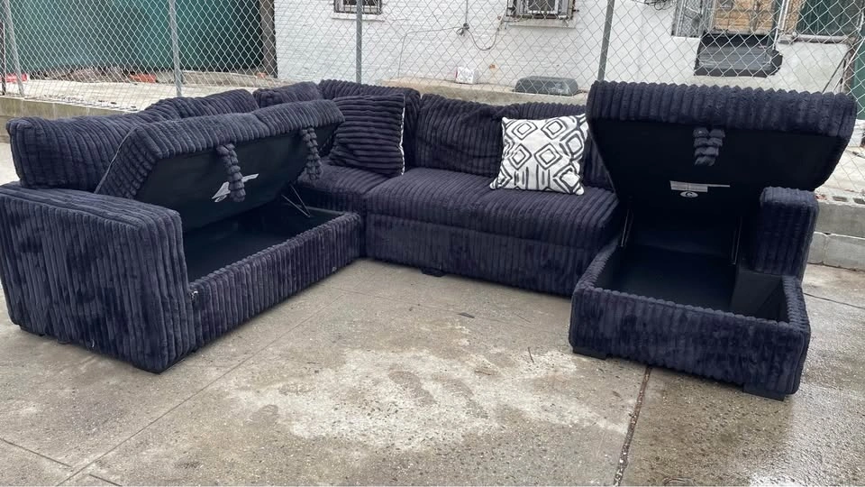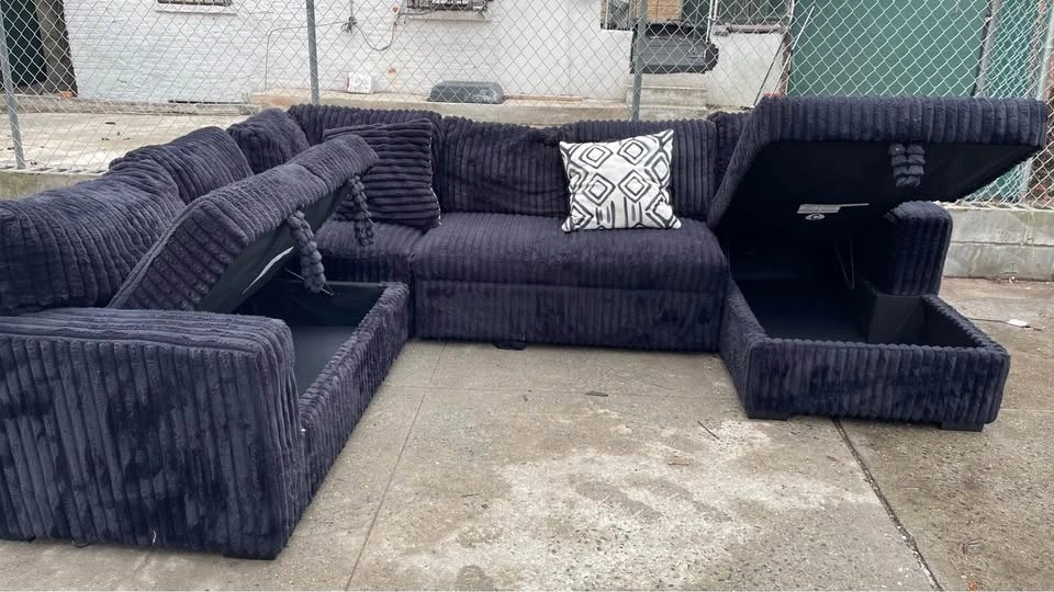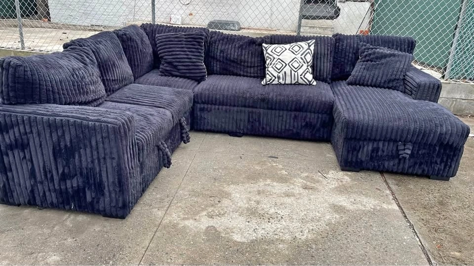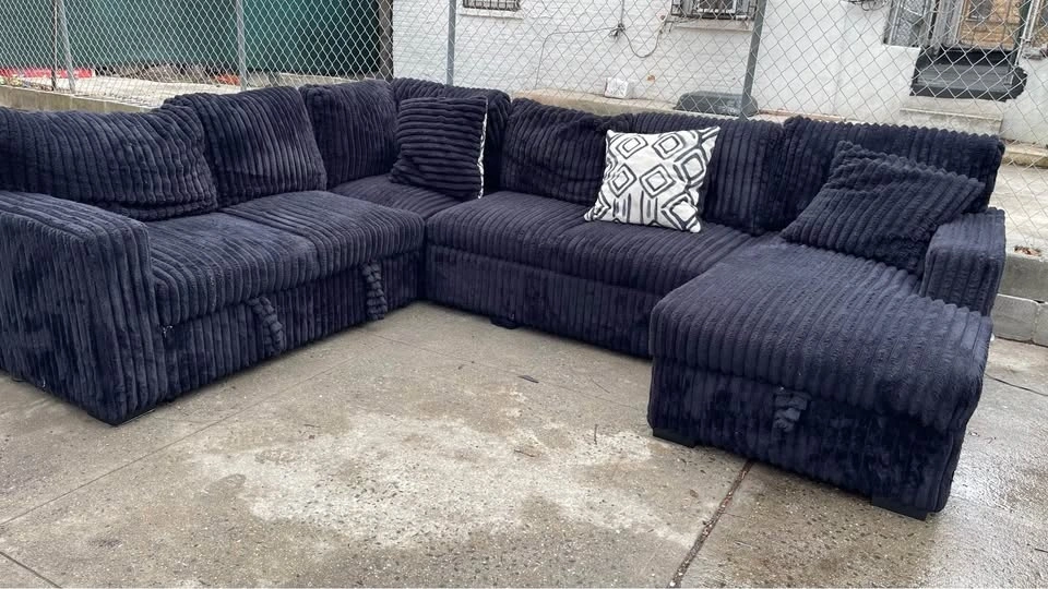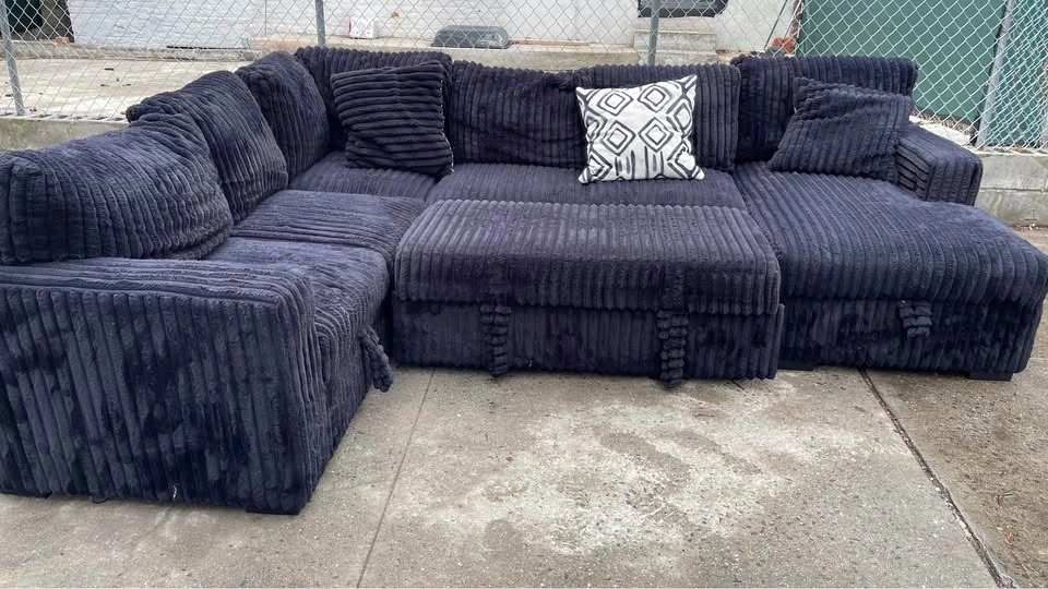 Selling a comfortable black Corduroy sectional sofa. It's perfect for a living room or entertainment space. The material is soft and inviting, making it a great spot to relax and unwind after a long day. It's a great addition to any home!