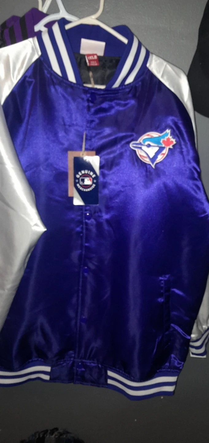 This is a satin bomber jacket featuring the Toronto Blue Jays logo on the front and 'Maple Leafs' embroidered across the back. It has white sleeves and a blue body with ribbed cuffs and hem. It's a great piece for any fan!
