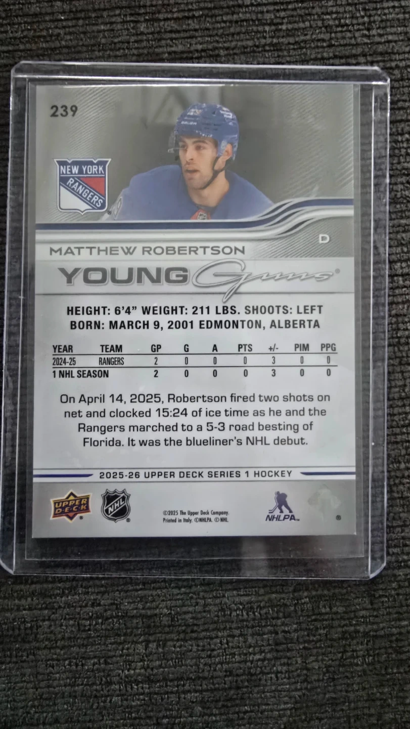 This is a mint condition 2025-26 Upper Deck Series 1 hockey card featuring Matthew Robertson. It's part of the Young Guns collection. Robertson's stats for the 2024-25 NHL season are included. The card measures standard trading card size.