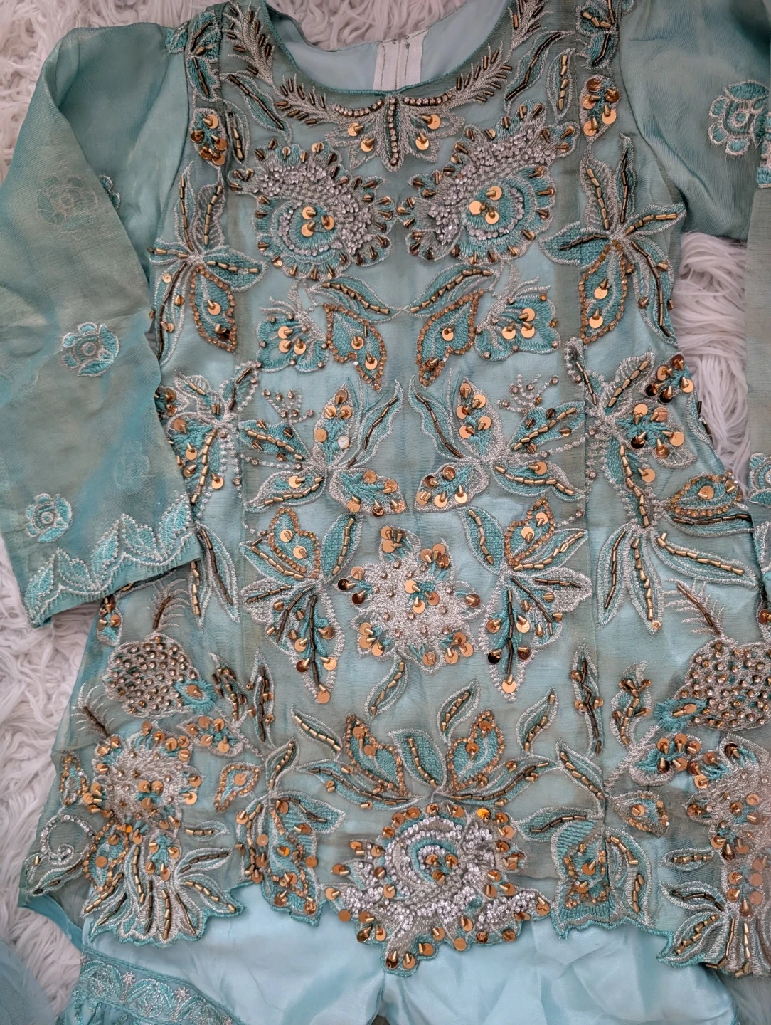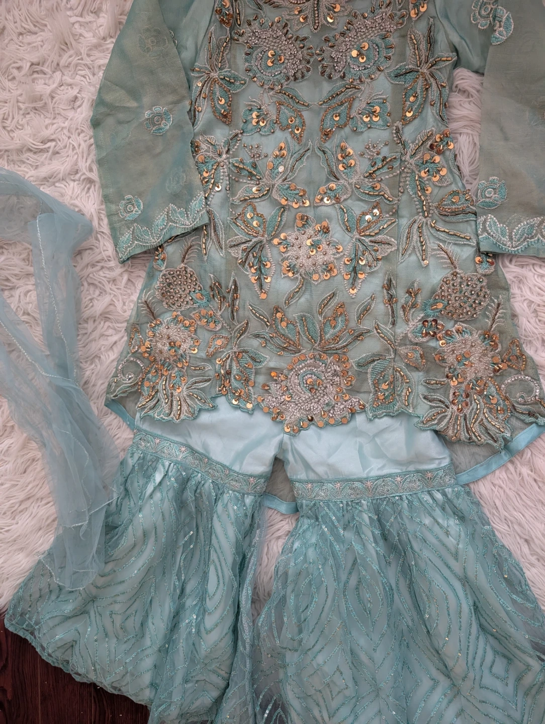Beautifully crafted light blue gharara set. It's intricately embroidered with silver and gold threads, accented with shimmering sequins. The set includes a kameez, sharara pants, and a dupatta, all in a lovely hue.