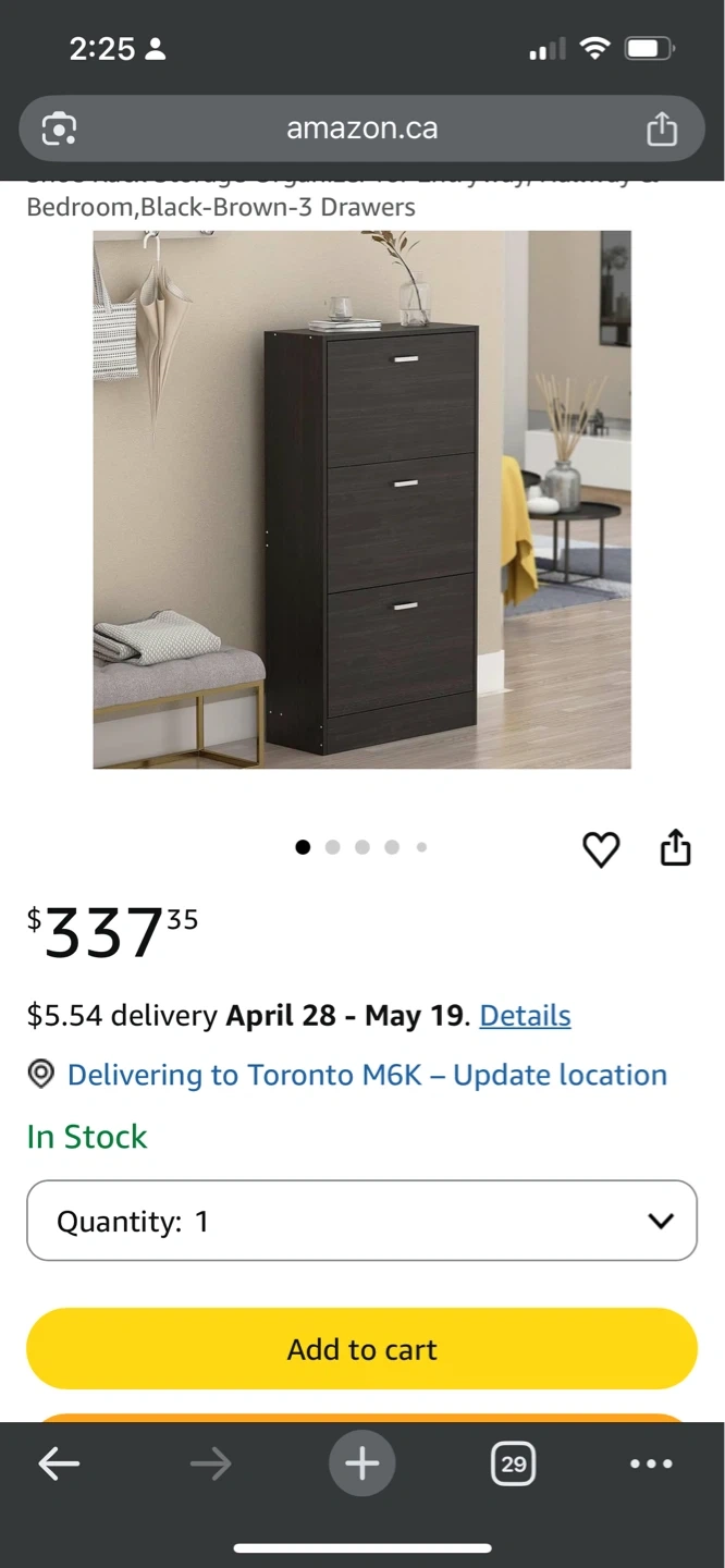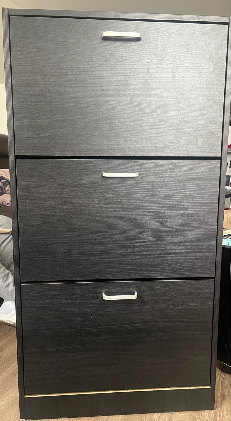 This is a 3-drawer storage organizer with a black-brown finish. It's 45.5" tall, 23.6" wide, and 9.4" deep. It has silver handles for each drawer. Shoe cabinet