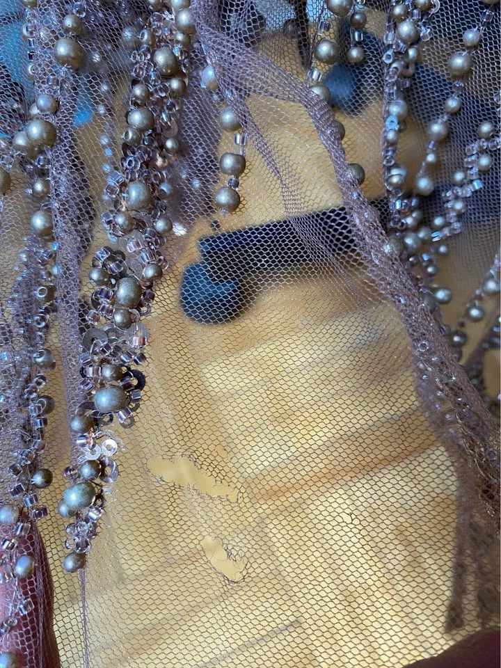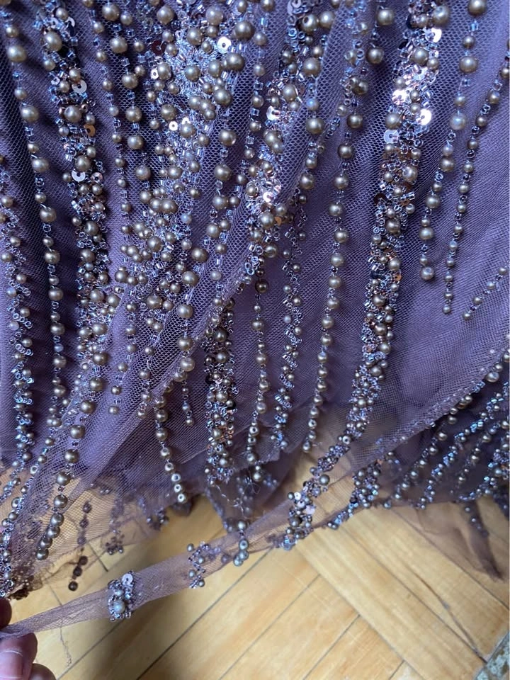 Wore to a wedding once. Small rips/ delicate tears at the bottom of the dress, as it shows in the pictures. Great for a special event. Originally paid $500, selling for $320. Pickup only.
