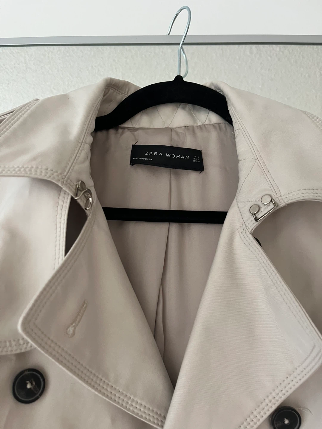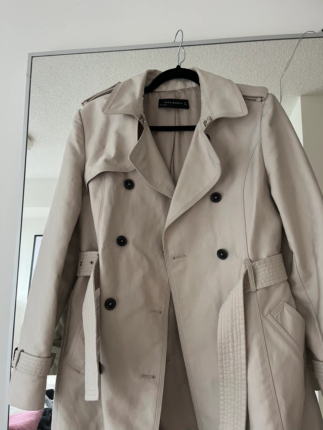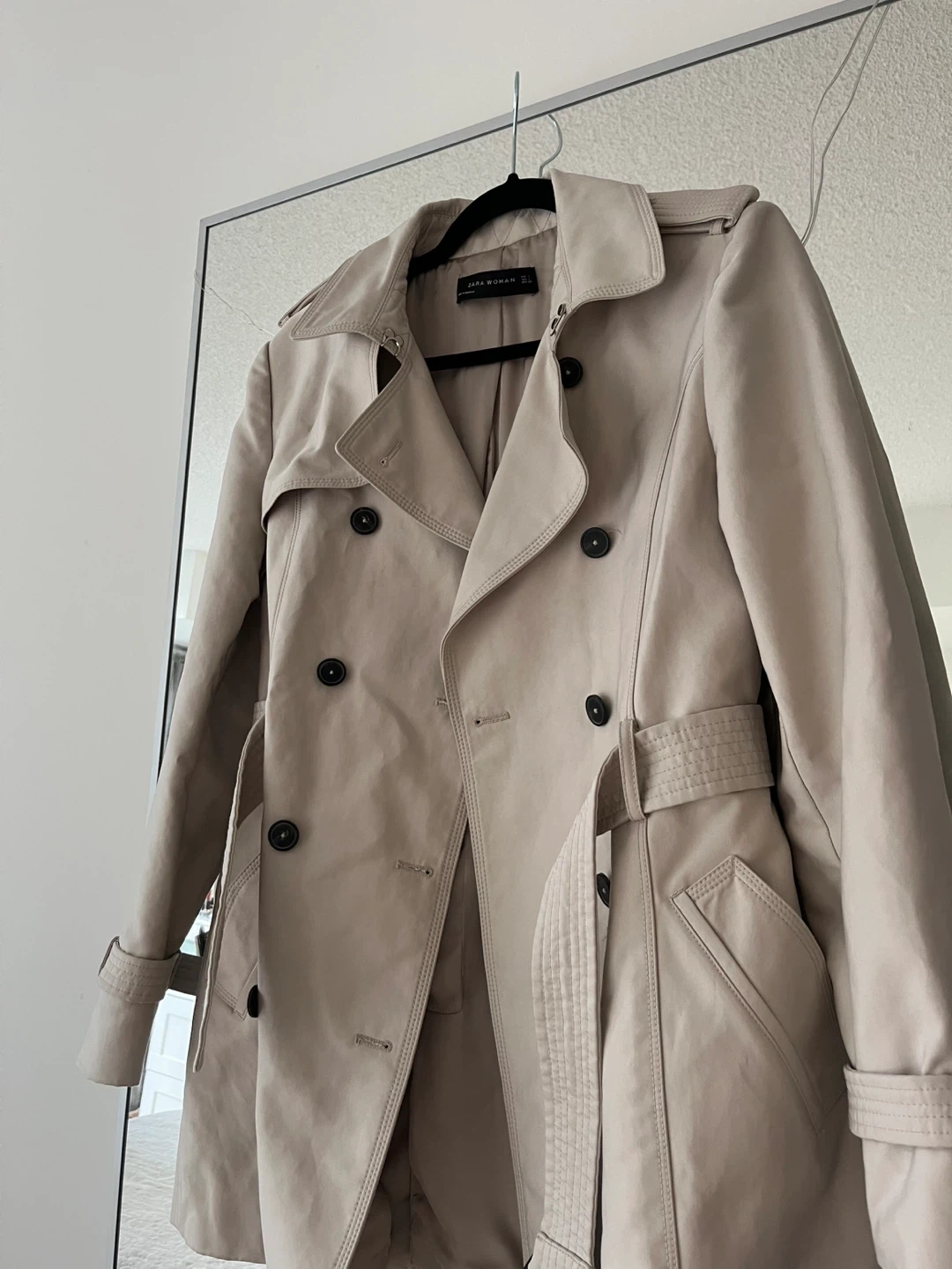 Classic beige trench coat from Zara with buttons and a belted waist.