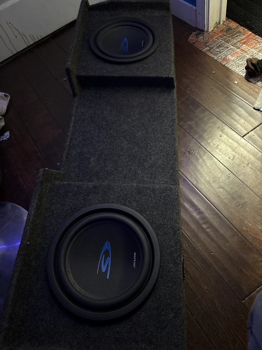 Alpine dual subwoofer enclosure, grey carpet finish. These subs pump out serious bass! It's ready to be installed in your vehicle. I am selling low price die to emergency need money my friend need for rent pay