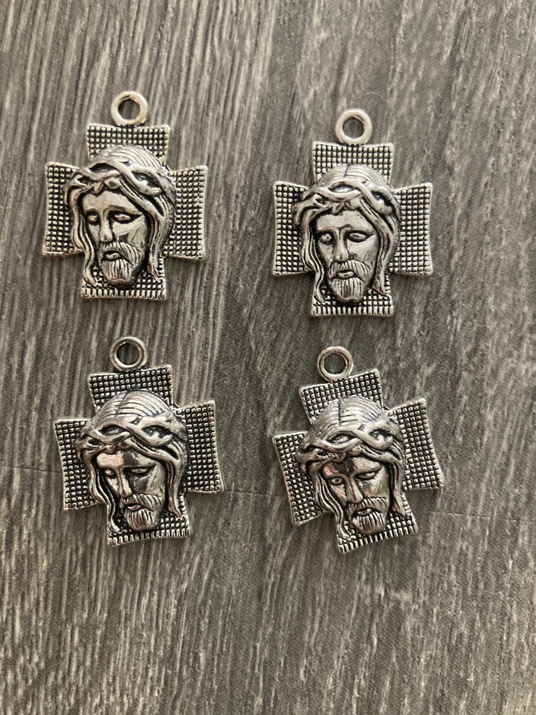 This listing is for a set of four silver-tone charms. Each charm features a detailed image of Jesus' face on a textured cross. These would be great for crafting or religious projects!